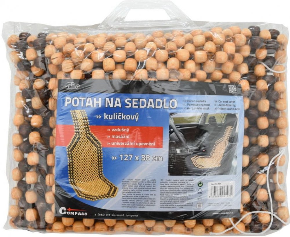 Vzdušný masážní potah na sedadlo automobilu, univerzální upevnění na většinu běžně používaných sedadel. Potah je vyroben z dřevěných kuliček, které příjemně masírují tělo, podporují krevní oběh, pomáhají snižovat únavu i bolestivost zad a umožňují proudění vzduchu mezi sedadlem a zády řidiče.