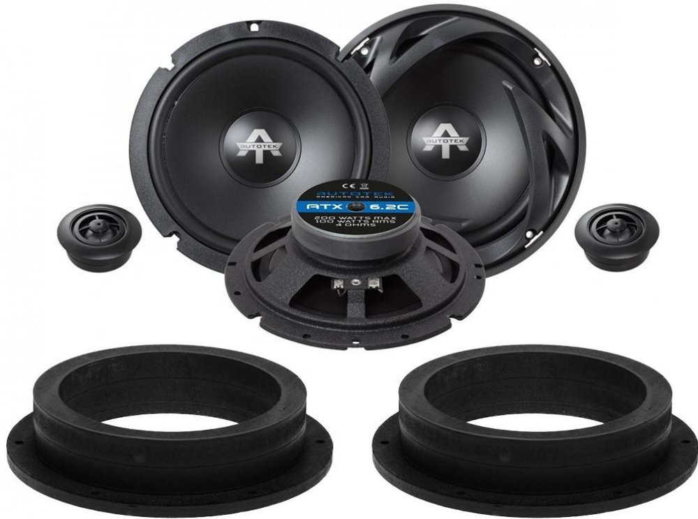 Ohm 1 pár komponentních reproduktorů Autotek ATX6.2C (2x středobas, 2x výška, výhybky) Ohm 1 pár MDF podložek přesně pro Volkswagen T5 z roku 2003-2015 do předních dveří (2ks MDF podložek)