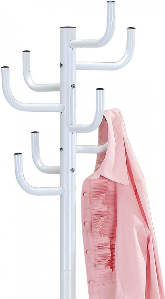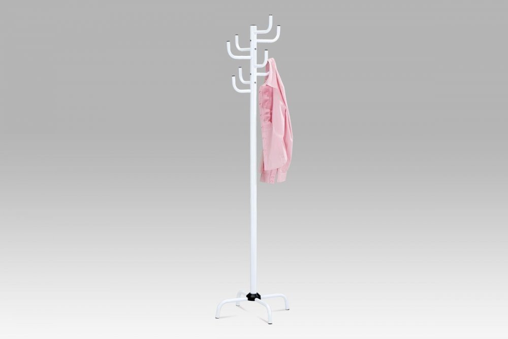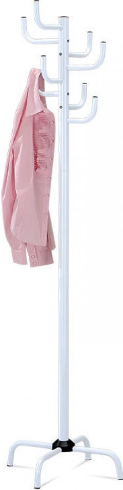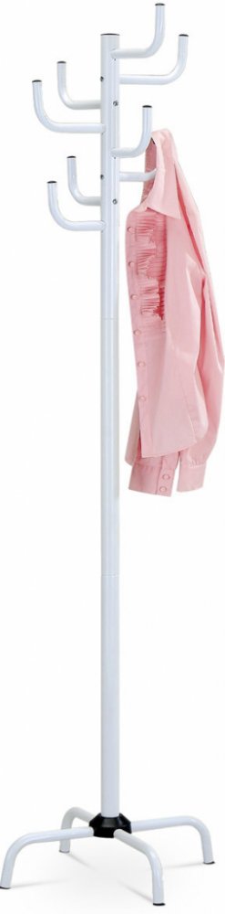 Kovový, volně stojící věšák ve futuristickém designu s velkými závěsnými háčky v různých výškových úrovních. Háčky jsou zakončeny zaoblenými plastovými záslepkami z černého plastu. Stabilní a lehká konstrukce je z kovových trubek v bílém lesklém práškovém laku a zakončena čtyřmi stabilními kovovými nohami z ohnutých trubek. Trubky jsou ukončeny plastovými kluzáky, zamezující poškození podlahy. Dod...