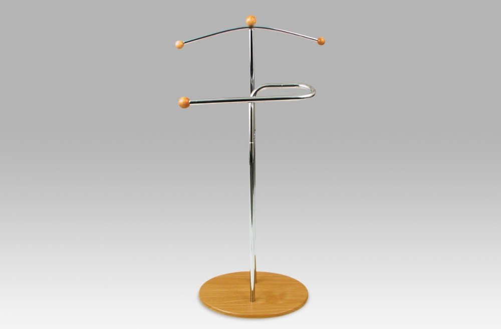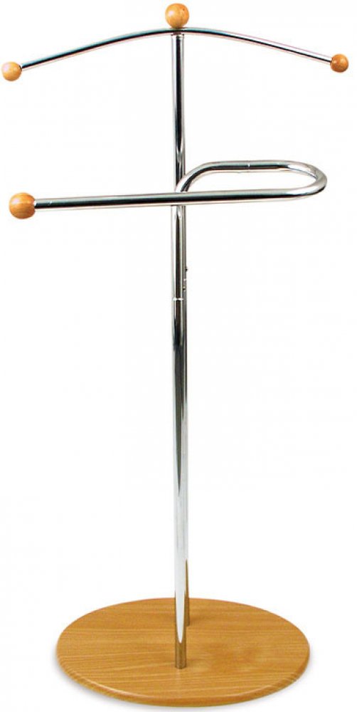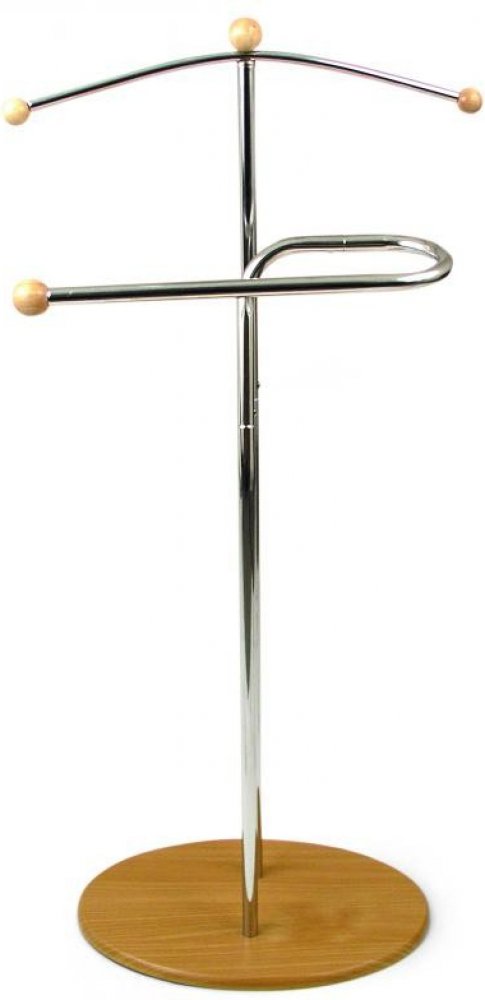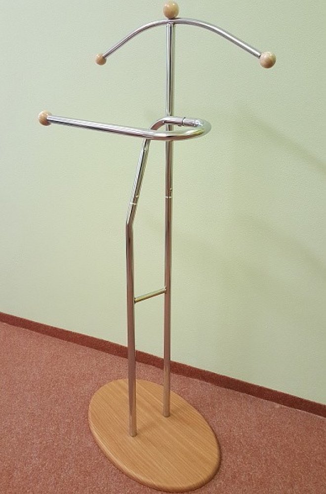 NĚMÝ SLUHA - věšák z kovu a masivu kaučukovníka - výška 110 cm Praktický minimalistický němý sluha v sobě kombinuje prvky z masivního kaučukovníkového dřeva mořeného do odstínu světlá třešeň s kovovými nosnými díly v chromované povrchové úpravě. Výška 110 cm vám umožní zavěšení oblečení i doplňků zcela bez pomačkání. Nosnost stojanu je až 5 kg rovnoměrně rozprostřené zátěže, hmotnost 3 kg. Konstrukce je zakončena velkou kruhovou podestou. Stojan je jednoduše přenositelný a lze ho umístit podle momentální potřeby i nálady. Stylem a jednoduchostí se hodí do jakéhokoli interiéru. Využití je nepřeberné, záleží jen na vás.