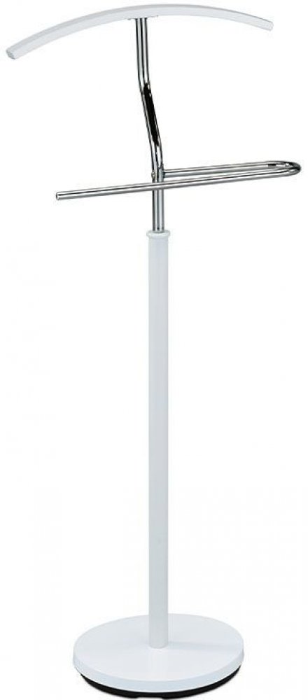 Praktický domácí komorník na šaty. Tento němý sluha je vyrobený z kovu v provedení chrom lesk. Horní ramínko a spodní tyč jsou z dřevěného MDF profilu upraveného bílým lakem a spodní kryt podstavce je z bílého plechu. Pro vyšší stabilitu je podstaven doplněn zátěží.