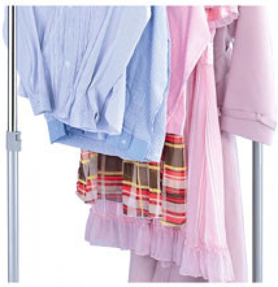 Stojan na zavěšení šatů, konstrukce je kombinací šedého plastu a šedého a chromovaného kovu. Doporučená nosnost je 5 kg rovnoměrně rozložené zátěže na nosném ramenu. Stojan je určený do domácnosti a není určen pro zátěžový provoz. Pro snazší manipulaci je vybaven plastovými kolečky. Dodáváno v demontovaném stavu.
