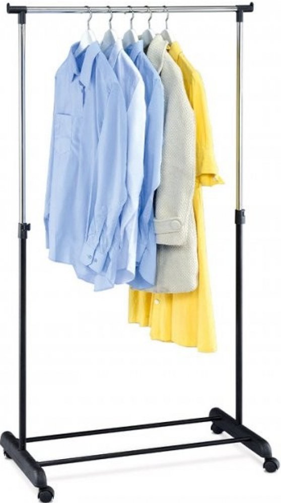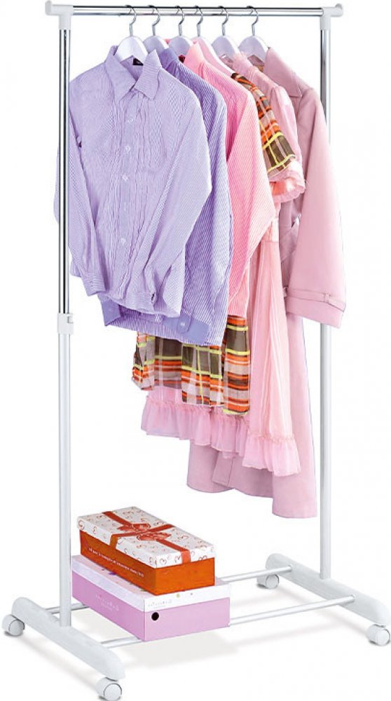 Jednoramenný stojan na šaty v bílé barvě kombinuje pevný kovový rám s praktickými plastovými prvky a chromovanou tyčí pro zavěšení oděvů. Výška stojanu je nastavitelná, což umožňuje přizpůsobení různým délkám oblečení a usnadňuje jeho organizaci. Spodní odkladač poskytuje prostor pro uložení krabic nebo dalších doplňků, čímž zvyšuje funkčnost a využití prostoru. Stabilní podstava na kolečkách umožňuje snadnou manipulaci a přesun v interiéru. Díky kvalitnímu zpracování a kombinaci materiálů je stojan vhodný pro domácí i komerční použití.