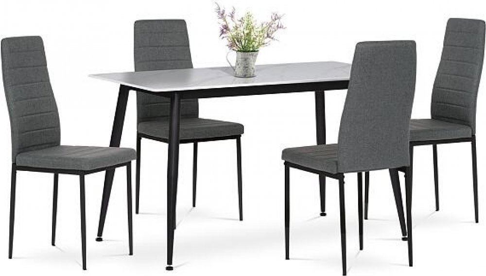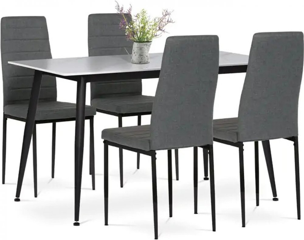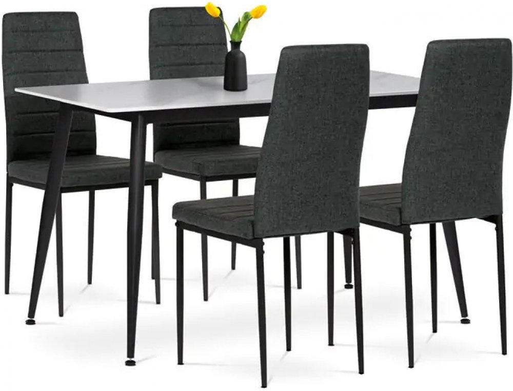 Obdélníkový stůl s deskou ze slinuté keramiky v bílém mramorovém dekoru působí elegantně a je odolný vůči poškrábání. Stabilitu zajišťují černé kovové nohy s jemně kónickým tvarem. Pohodlné židle mají čalounění z hladké černé látky a ergonomicky tvarovanou opěrku pro maximální komfort. Černé kovové nohy ladí se stolem a dodávají celku jednotný vzhled. Ideální volba pro stylové a funkční stolování.