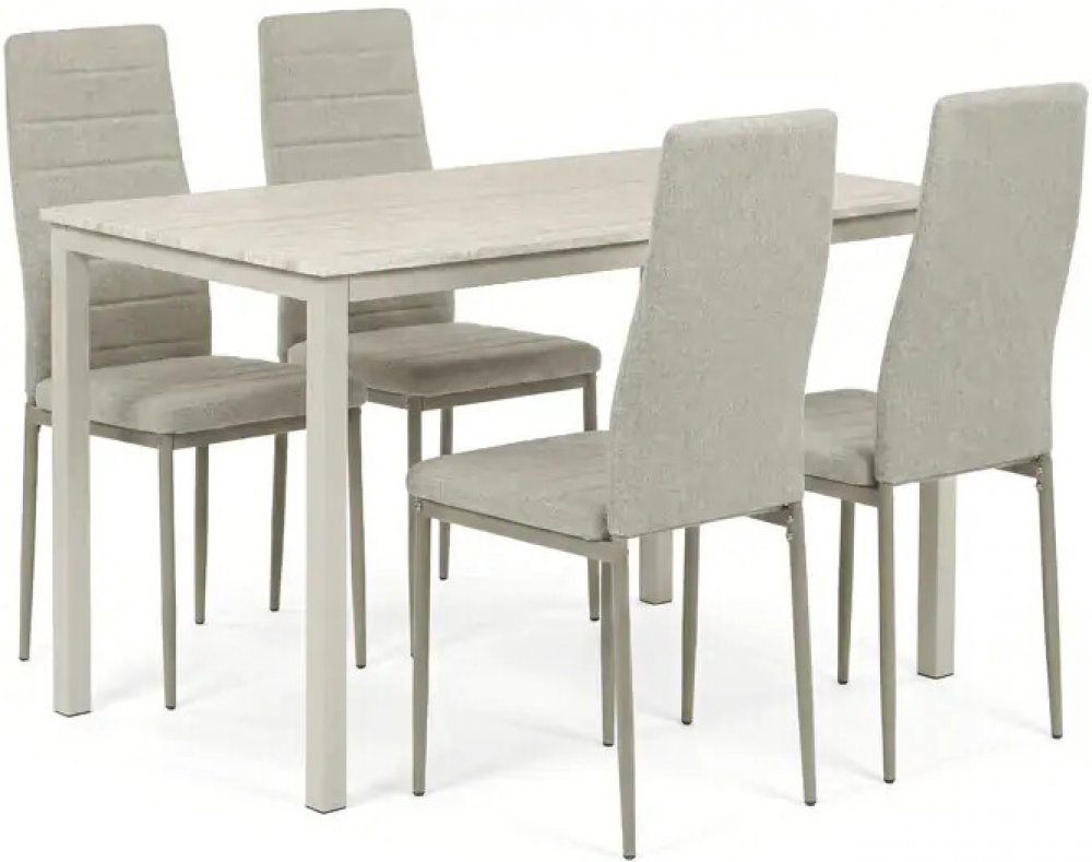 Deska stolu je vyrobena z MDF s dekorativním povrchem v odstínu travertinu, který napodobuje přírodní kámen a snadno se udržuje. Stabilní kovové nohy stolu v barvě kašmír zajišťují pevnost a dlouhou životnost, zatímco židle mají kovovou konstrukci v cappuccino odstínu a jsou čalouněné příjemnou látkou, která podporuje komfort při sezení.