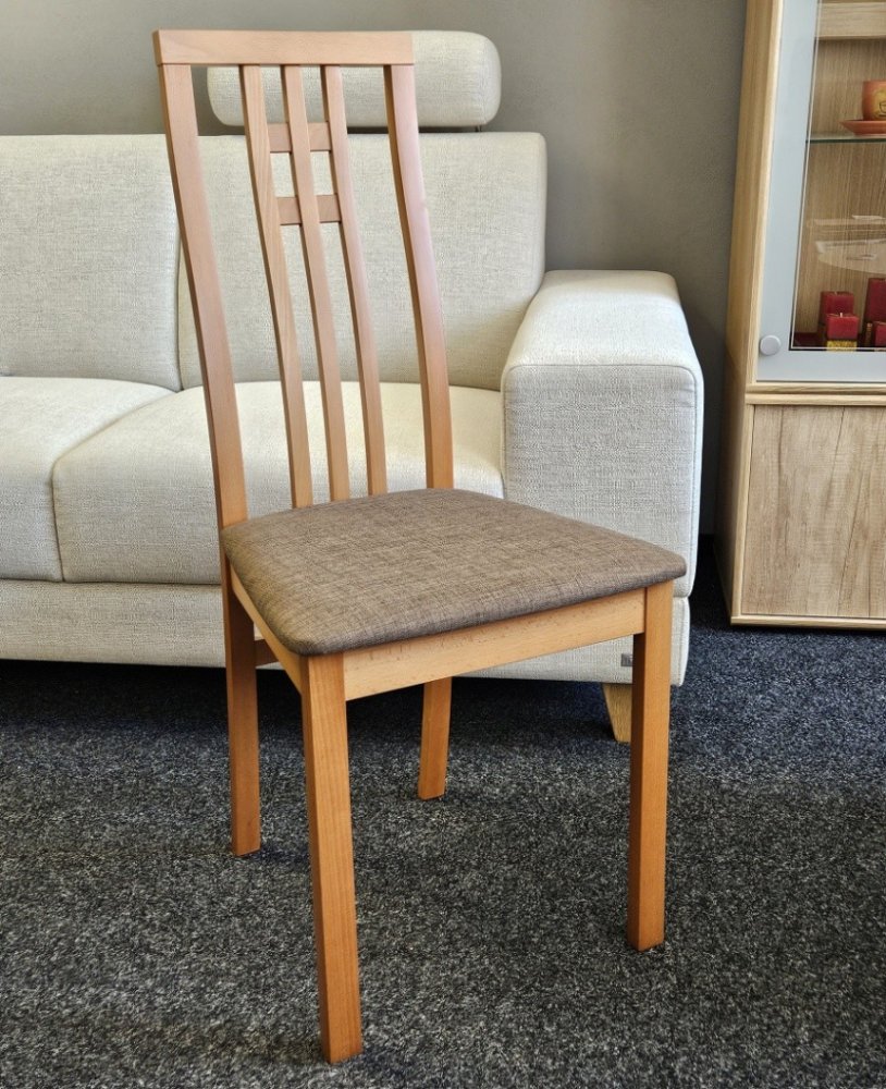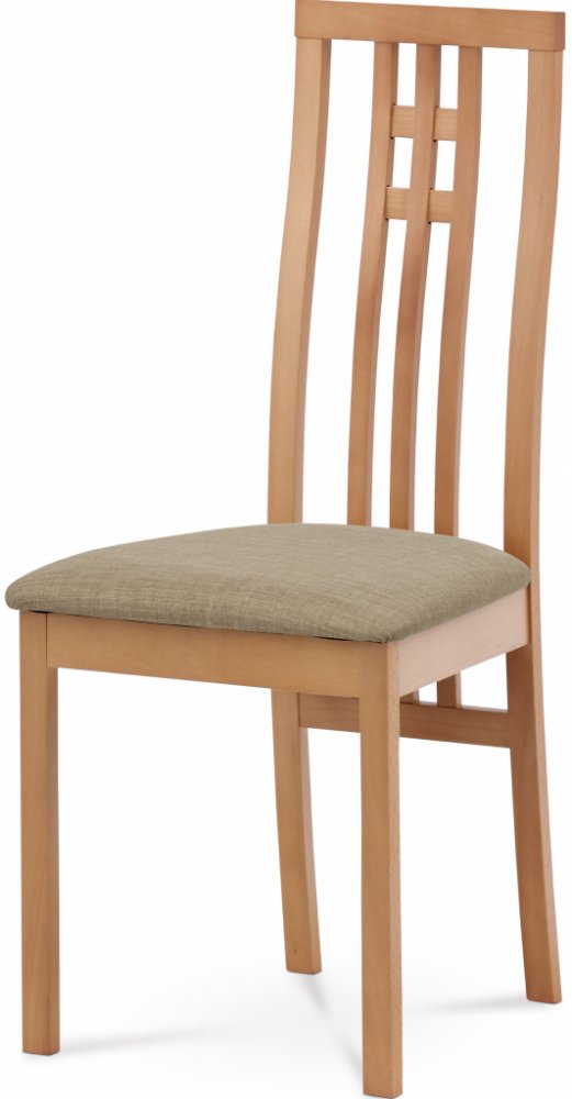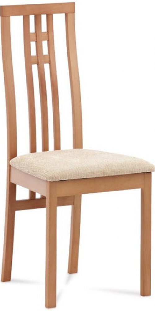 Dřevěná jídelní židle je vyrobená z masivu buku. Konstrukce židle je v barvě buk přírodní. Sedák židle je čalouněný PUR pěnou a potažený látkou v barvě béžové.