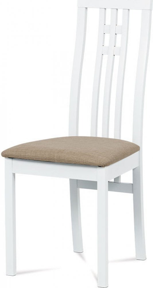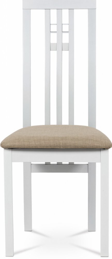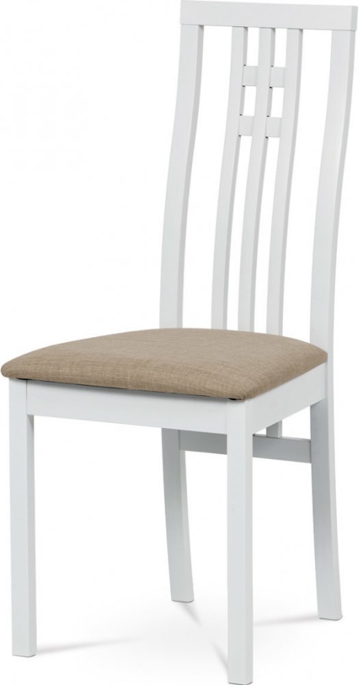 Jídelní židle BC-2482 WT z masivního buku v bílé barvě nabízí pevné a stabilní provedení vhodné pro každodenní použití. Rám i nohy jsou vyrobeny z kvalitního masivního dřeva, které je upraveno bílým lakem s hladkým povrchem odolným vůči běžnému opotřebení. Sedák je čalouněný látkou v béžovém odstínu, která přispívá k pohodlí při sezení a zároveň snadno zapadne do různých interiérových stylů. Opěradlo je tvořeno vertikálními dřevěnými lamelami s decentním propleteným vzorem, který dodává židli jemný dekorativní prvek. Židle nemá područky ani otočný mechanismus, což zajišťuje jednoduchost a kompaktnost designu. Nosnost židle je standardní pro jídelní sezení a rozměry odpovídají běžným parametrům jídelních židlí.