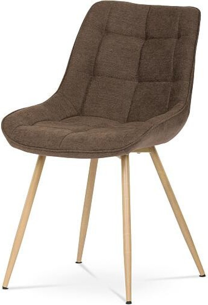 Židle jídelní, hnědá látka, kovové nohy, 3D dekor dub CT-394 BR2 - Designová skořepinová jídelní židle je čalouněna hnědou látkou s výrazným prošitím sedací části i části určené k opření. Sedací část je zaoblená a má vyvýšené boky, plynule přecházející do opěráku. Polstrování je z kvalitní PU pěny. Čtyřnohá kovová podnož je v 3D dekoru dub. Nohy jsou kruhového průřezu a kónické, ukončené černými platovými kluzáky. Celá podnož je svařená a dodávána jako celek, nehrozí tedy občasné dotahování šroubů jako u podnože šroubované.Toto vše působí nejen jako stylový designový prvek, ale dělá židli velmi pevnou, pohodlnou a praktickou na kratší i delší posezení. Svým provedením ve Skandinávském stylu a decentní barevností se židle hodí nejen k jídelnímu stolu, ale i jako součást pracoven či konferenčních místností.
