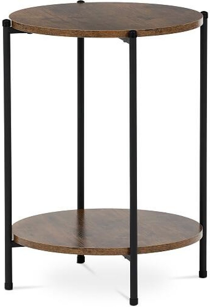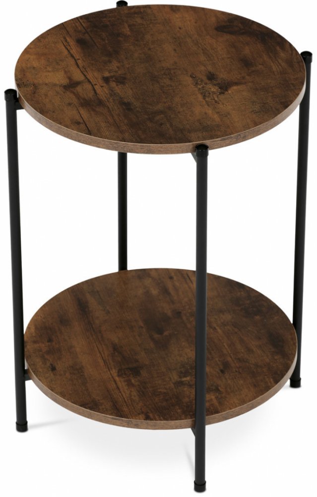 Kulaté desky v dekoru starého dřeva dodávají stolku přírodní eleganci, zatímco černě lakovaný kovový rám zajišťuje stabilitu a odolnost. Dvě praktické police nabízí dostatek prostoru pro uložení dekorací, knih nebo šálku kávy. Díky svému univerzálnímu vzhledu je tento stolek ideální volbou do obývacího pokoje, ložnice nebo kanceláře.