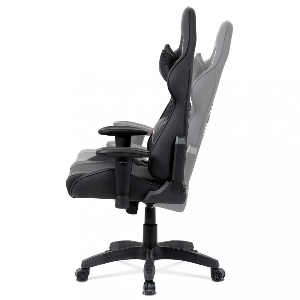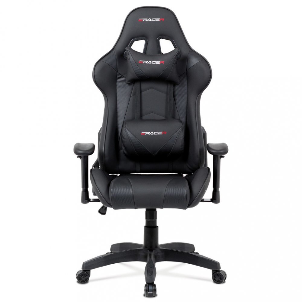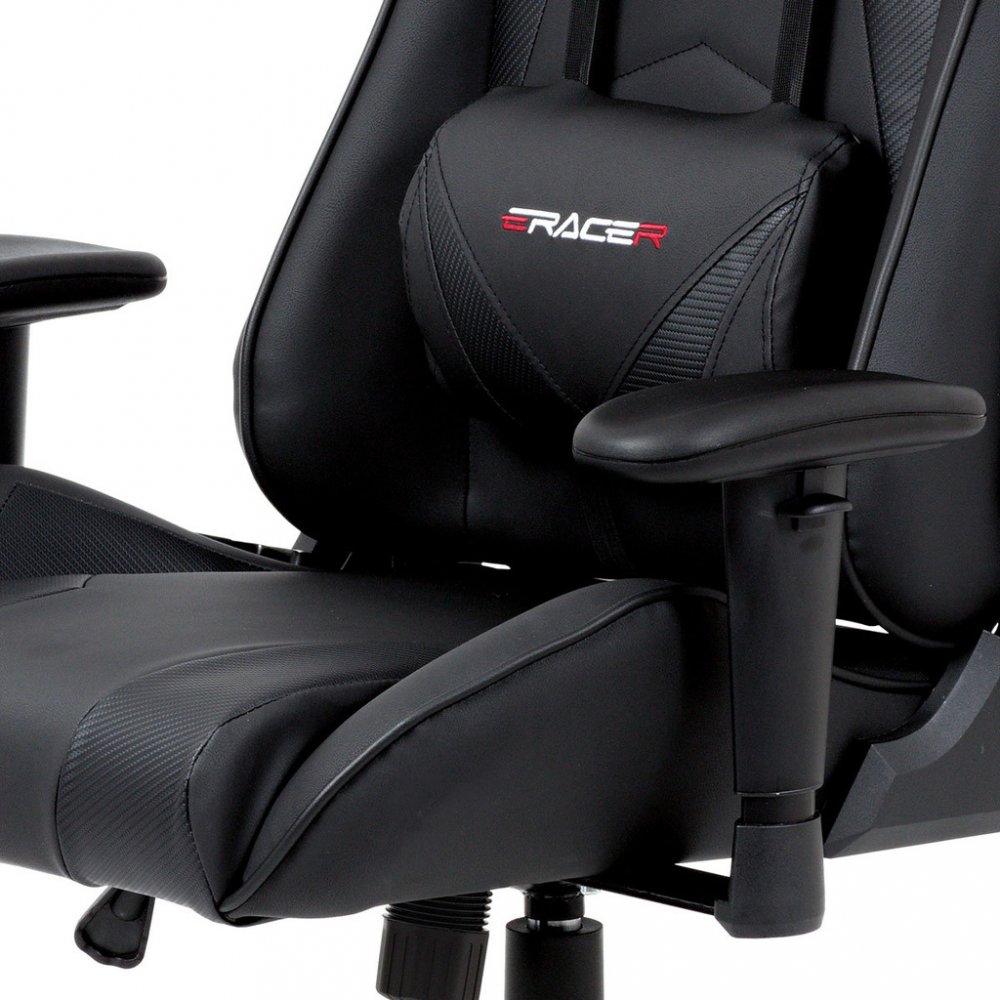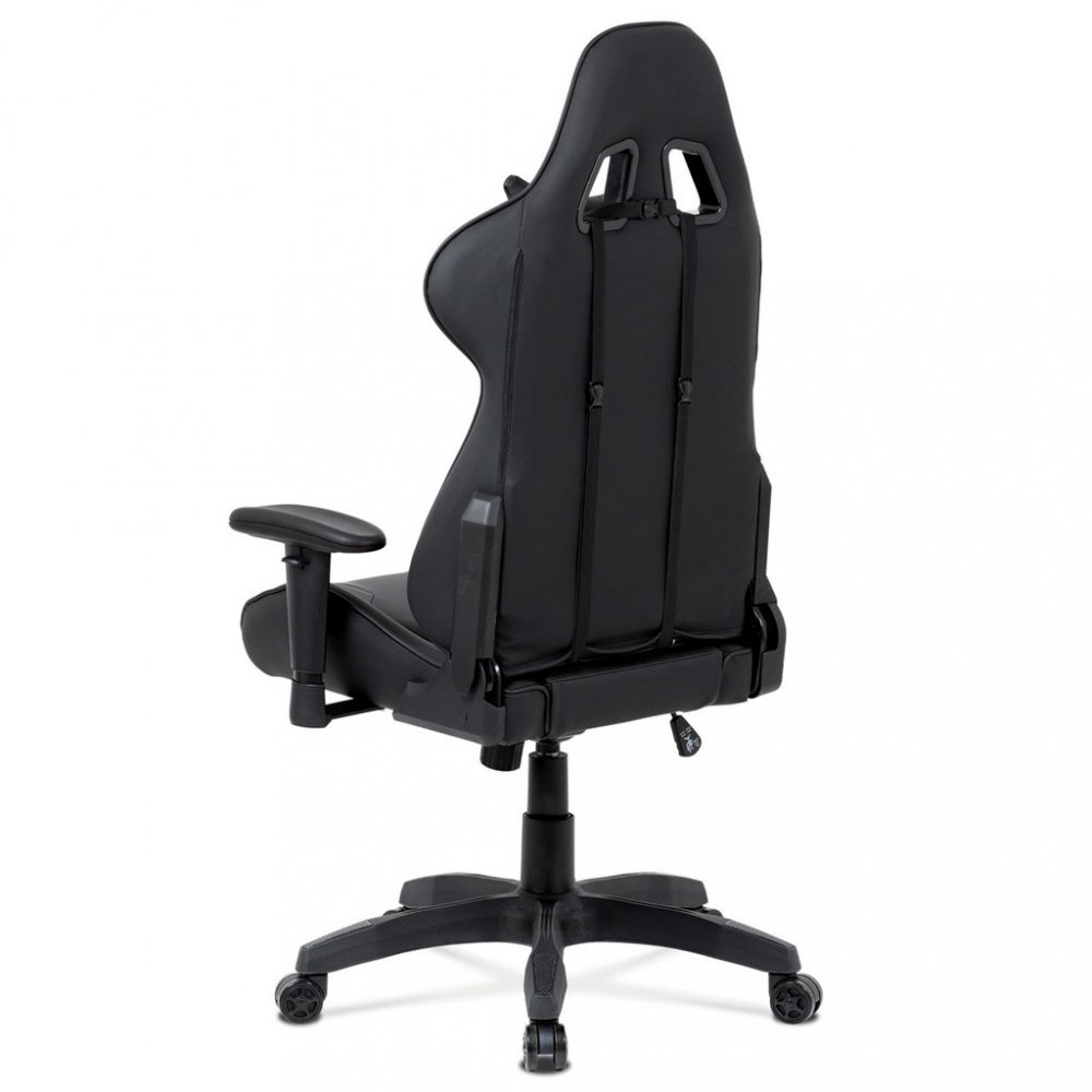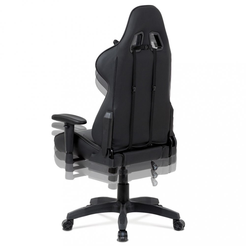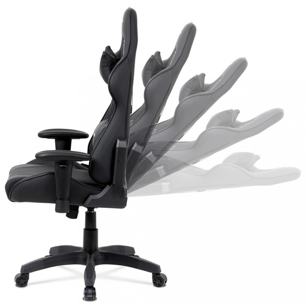 Herní křeslo potaženo koženou v černé barvě. Křeslo je velice pohodlné díky bohatému polstrování na sedáku a sklopnému opěradlu do úhlu 180°.