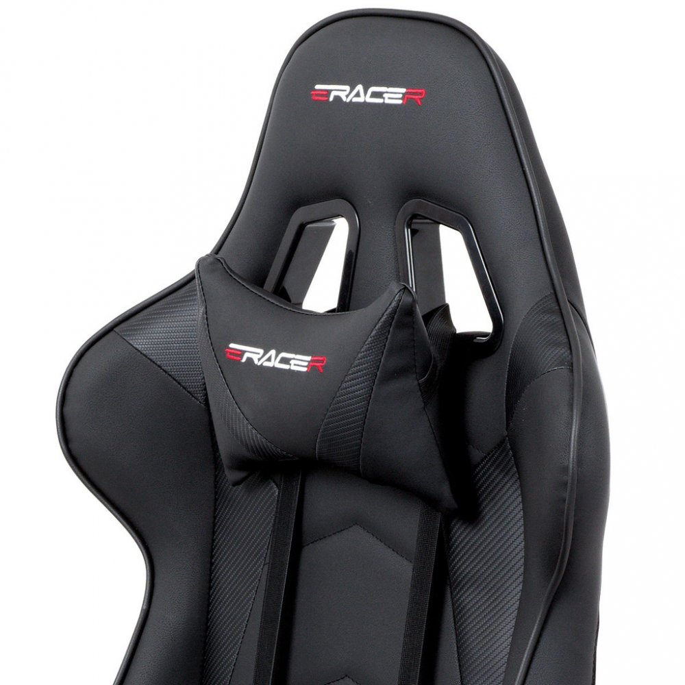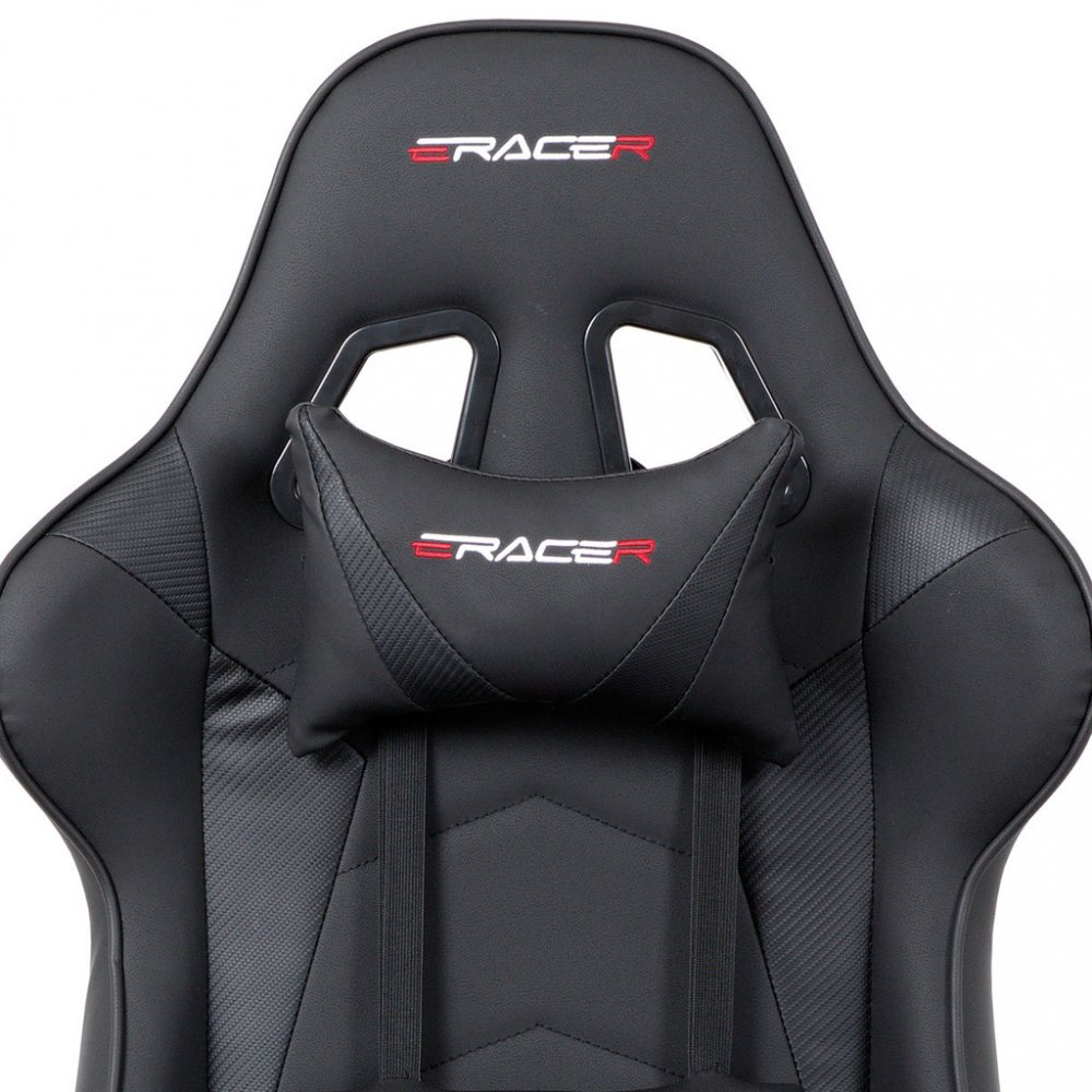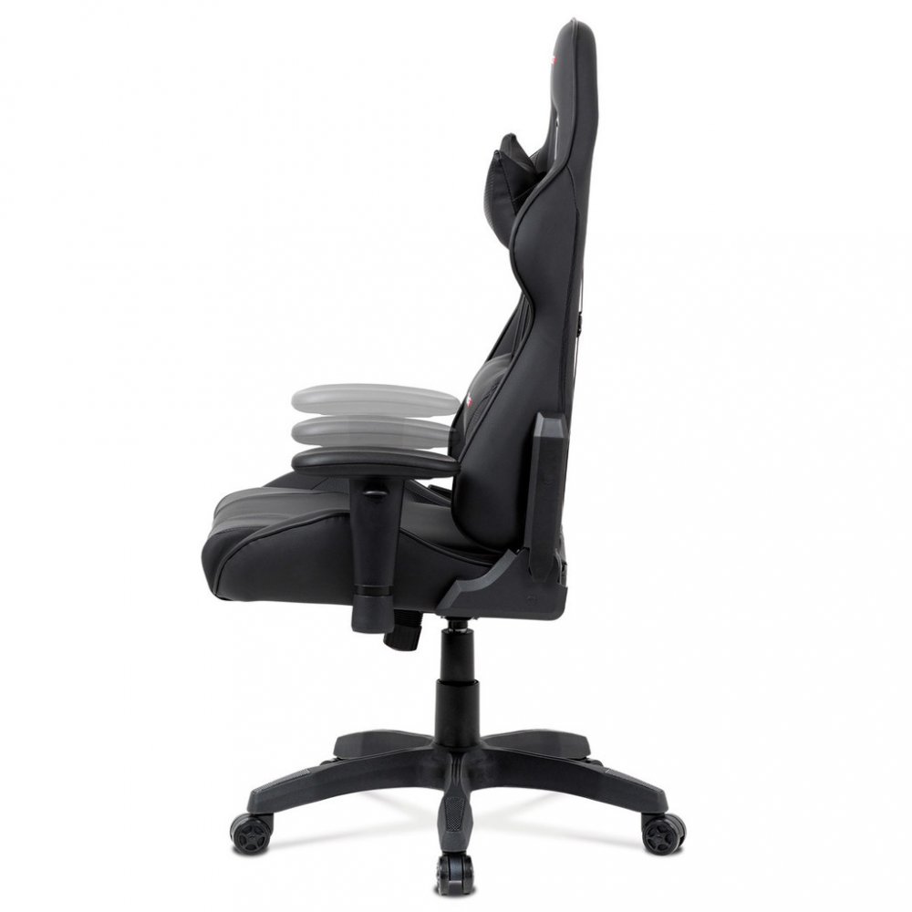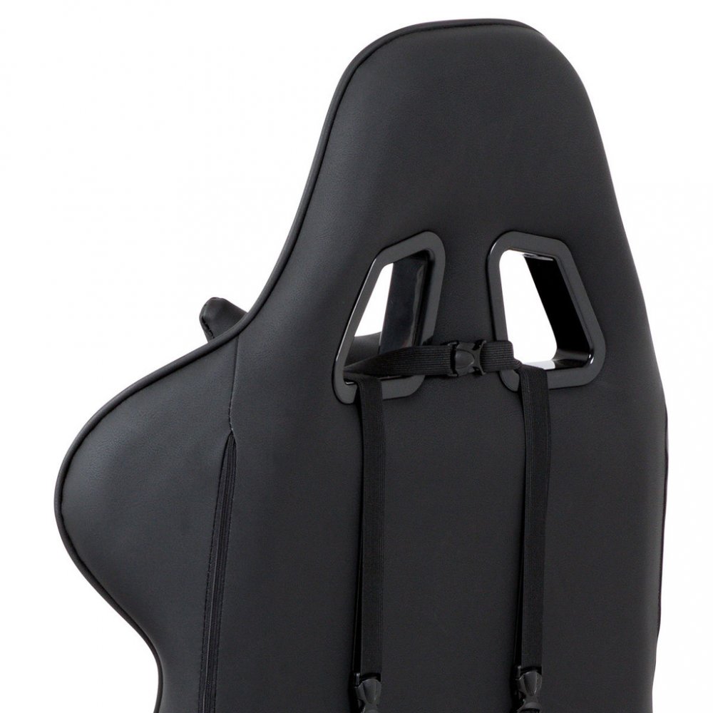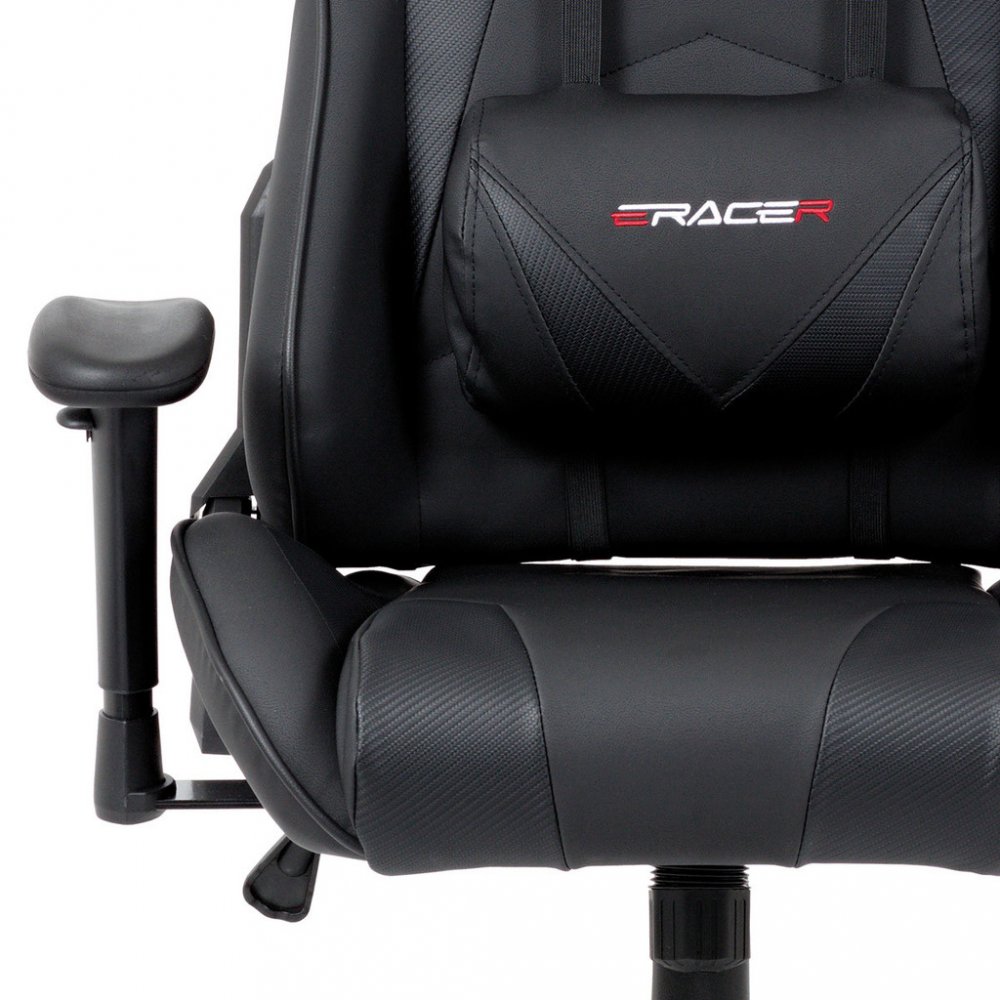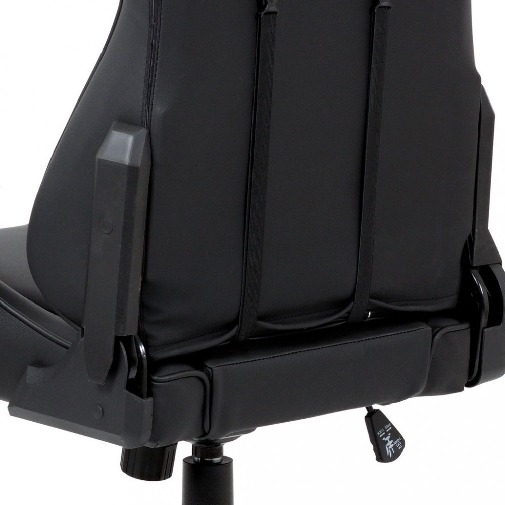 Herní křeslo potaženo koženou v černé barvě. Křeslo je velice pohodlné díky bohatému polstrování na sedáku a sklopnému opěradlu do úhlu 180°.