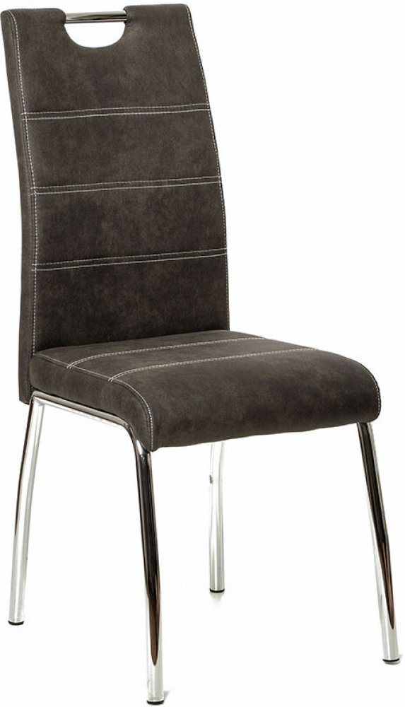 Moderní jídelní židle je čalouněná šedou látkou COWBOY v dekoru vintage kůže a s dekorativním bílým prošitím sedáku i opěráku. Líbivý design podtrhuje kovová podnož s chromovou úpravou. Podnož je navíc speciálně tvarovaná pro lepší stabilitu a bezpečí. Každá ze čtyř nohou je na černém plastovém kluzáku, což sníží riziko poškození Vaší podlahy. Pro snazší manipulaci má židle i madlo v horní části opěráku, které je kovové a též s chromovou úpravou. Nosnost židle je až 110 kg. Jídelní židle na kovové chromované podnoži. Je čalouněna šedou látkou Cowboy. Praktické madlo usnadňuje manipulaci se židlí. Židle je určena do domácností, není vhodná do zátěžových prostor. Dodáváno v demontu.