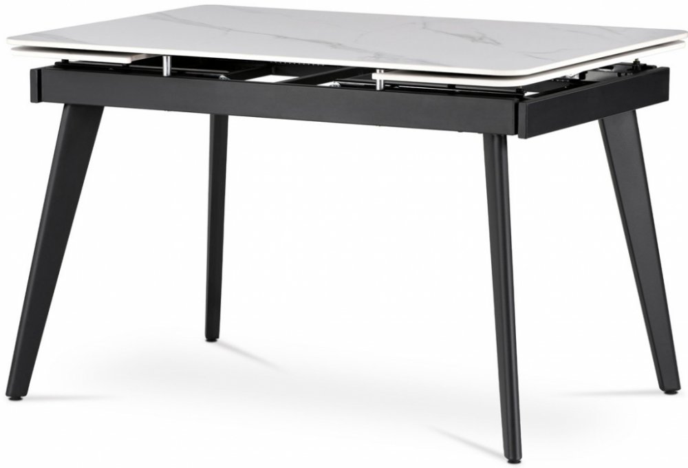 Jídelní stůl 120+30+30x80 x 76 cm, keramická deska bílý mramor, kov, černý matný lak HT-405M WT - Designový jídelní rozkládací stůl o rozměru 120 + 30 + 30 x 80 x 76 cm v industriálním minimalistickém stylu. Vrchní stolová deska je tvrzené keramiky tl. 12 mm v matném dekoru "Italský sněhobílý mramor". Konstrukce stolu i nohy jsou celokovové s nástřikem práškového vypalovacího laku v matném černém ...