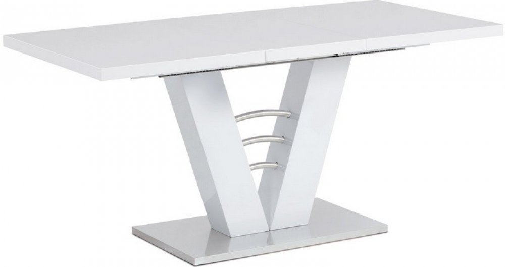 Designový jídelní stůl na zajímavě řešené podnoži s podstavou a doplňky z broušeného nerezu. Moderní bílý lesk v kombinaci s broušeným nerezem vypadá velmi přepychově. Doporučujeme kombinovat s židlemi, které mají podnož z broušeného nerezu.