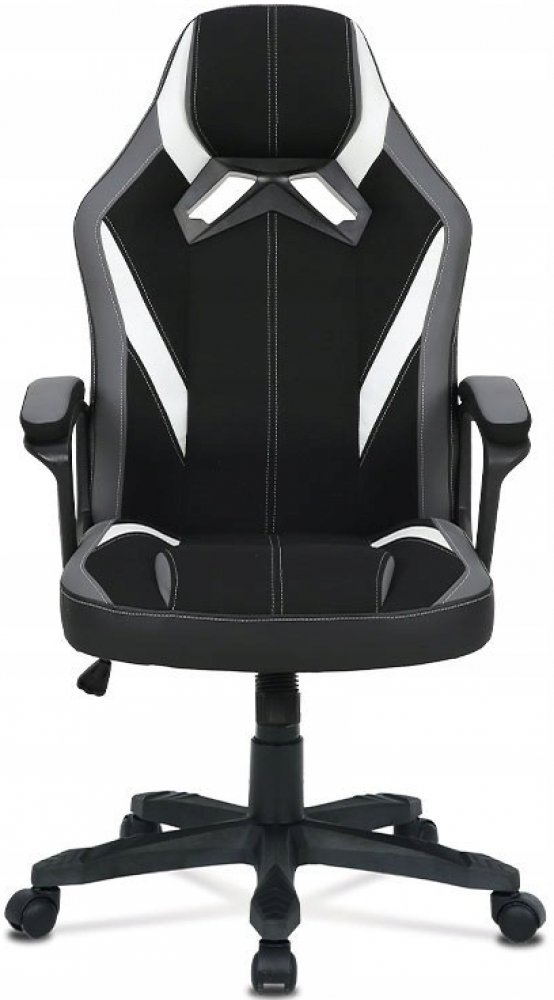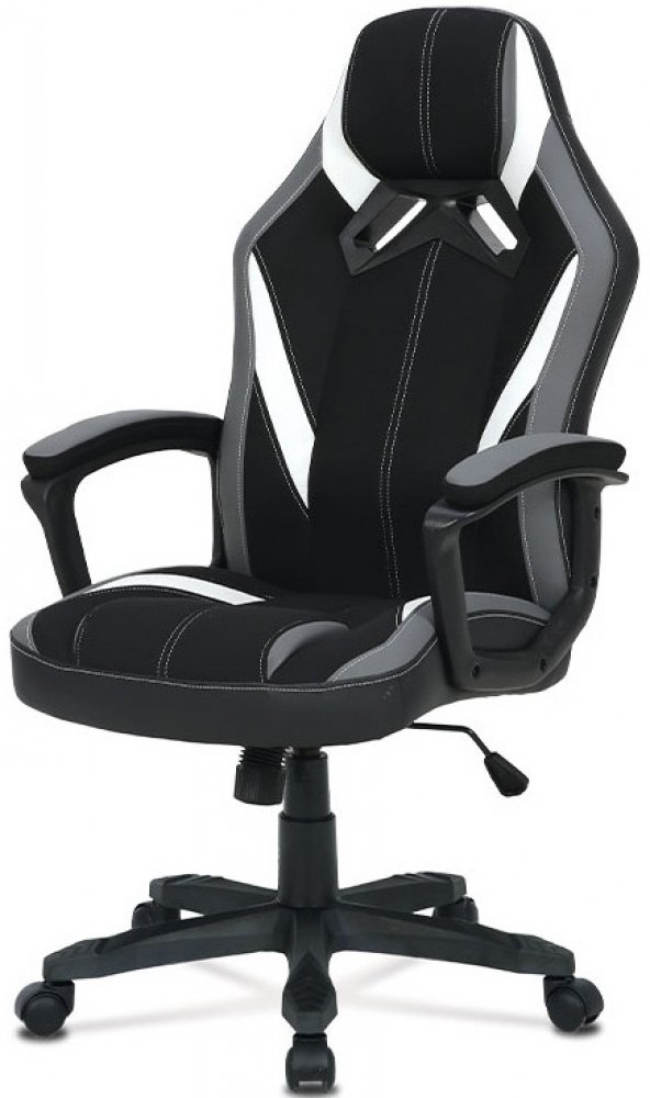 Elegantní a výrazné sportovní kancelářské křeslo v designu sedačky závodního vozu a zaoblenými liniemi. Má výborné ergonomické rozvržení. Potah je kombinací černé a šedé látky a bílé ekokůže, s decentním bílým prošíváním celého křesla. Kostra je z ocelových ohýbaných trubek. Masivní polstrování sedáku i opěráku z kvalitní PU pěny je zárukou pohodlného posezení při herních večerech. Ruce si můžete pohodlně položit na pevné plastové područky, opěrky jsou rovněž polstrované a potažené černou a šedou látkou. Křeslo je vybaveno houpacím mechanismem. Síla houpání se reguluje plastovým šroubem pod sedákem. Výška sezení se upravuje páčkou na pravé straně přes kvalitní plynový píst. Masivní černý plastový kříž s černými protiskluzovými doplňky je osazen plastovými kolečky vhodnými na koberce.
