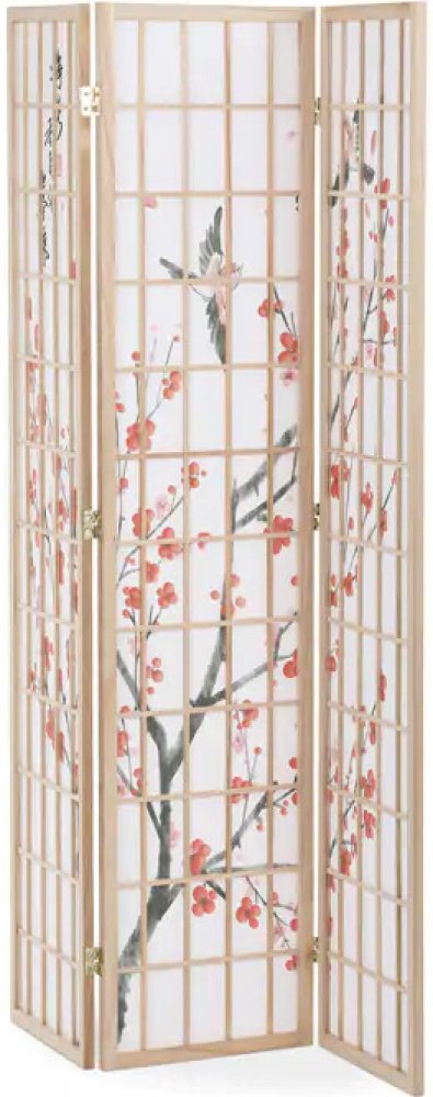 Třípanelový paraván EF-L185 NAT z masivního smrkového dřeva v přírodním odstínu nabízí lehkou a vzdušnou přepážku s bílou netkanou textilií, která je zdobená jemným motivem větví s květy a ptáky v černých a červených tónech.
