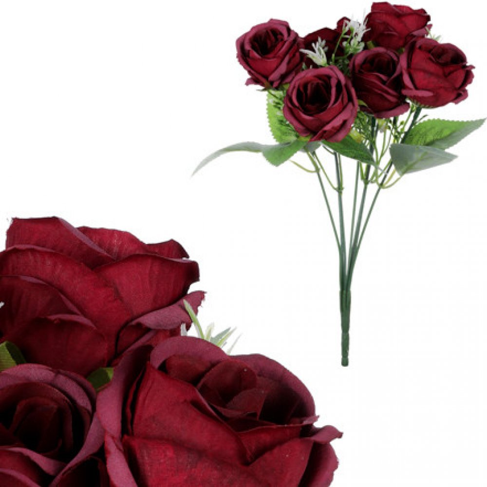 Velký pugét růží se sedmi květy. Kytice z umělých růží je jedinečnou dekorací, která přináší nekonečnou krásu a potěšení. Je skvělou volbou pro ty, kteří chtějí mít krásné květiny bez starostí a péče. Nemusíte se trápit zaléváním a případně tím, že vám brzy uvadne, protože jako umělá vydrží po celou dobu v plné kráse. Bez ohledu na roční období, vám poskytne oslnivou výzdobu každého místa nebo vybrané události. Široký výběr květin podle druhů a barev umožňuje, aby si každý vybral tu, která nejlépe vyhovuje jeho preferencím a stylu. Všechny umělé rostliny jsou věrnou kopií svých živých protějšků, a udržují svou nádhernou podobu v plném květu po celý rok. Vytvořte si díky této dekoraci dokonalou atmosféru bez starostí a užívejte si nikdy nekončící květinovou výzdobu.