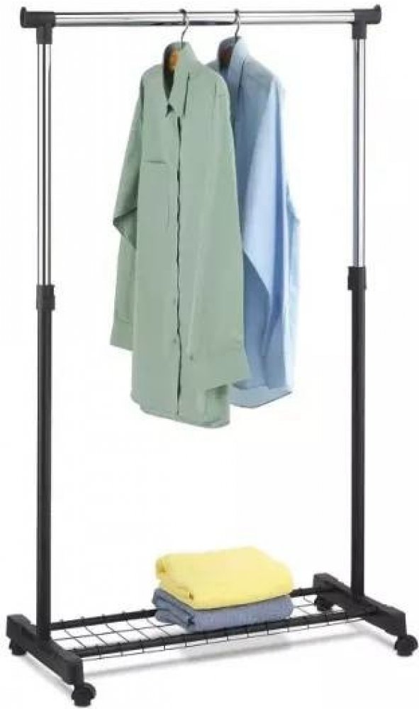 Stojan Na šaty Abd-1210 Stojan na šaty na kolečkách s praktickým odkladačem na boty, krabice, apod. Provedení chrom + černý nebo bílý plast.