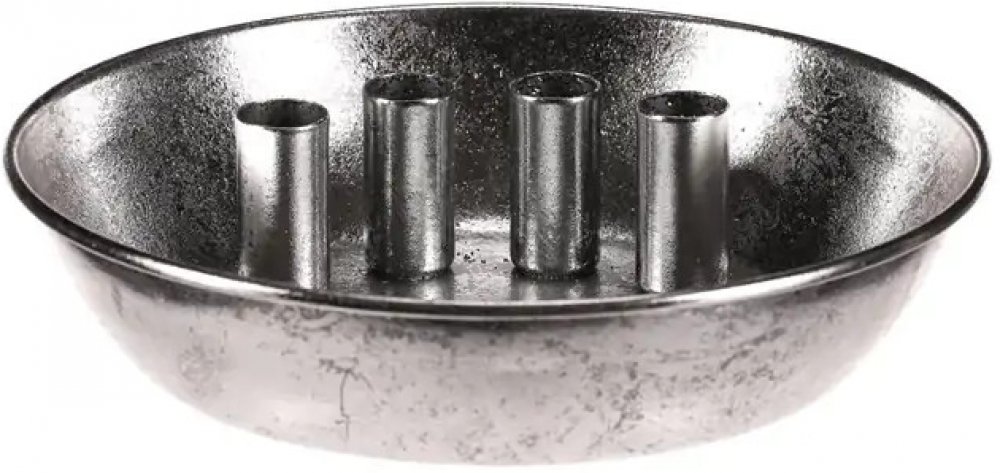 Moderní pojetí adventního věnce. Tento kovový svícen stříbrné barvy doplní moderní interiér nejen v čase vánočním. Dno misky disponuje 4 držáky pro umístěný kónických svíček.