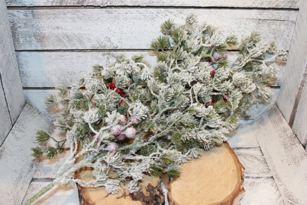 Kouzelná větvička, jemně posypaná sněhem, jako by ji právě přikryl zimní mráz. Červené jeřabiny dodávají dekoraci hřejivý kontrast a připomínají tichou krásu zimní přírody. Tato větvička se skvěle hodí do zimních, vánočních i podzimních aranží – do váz, truhlíků či dekorací na stůl.