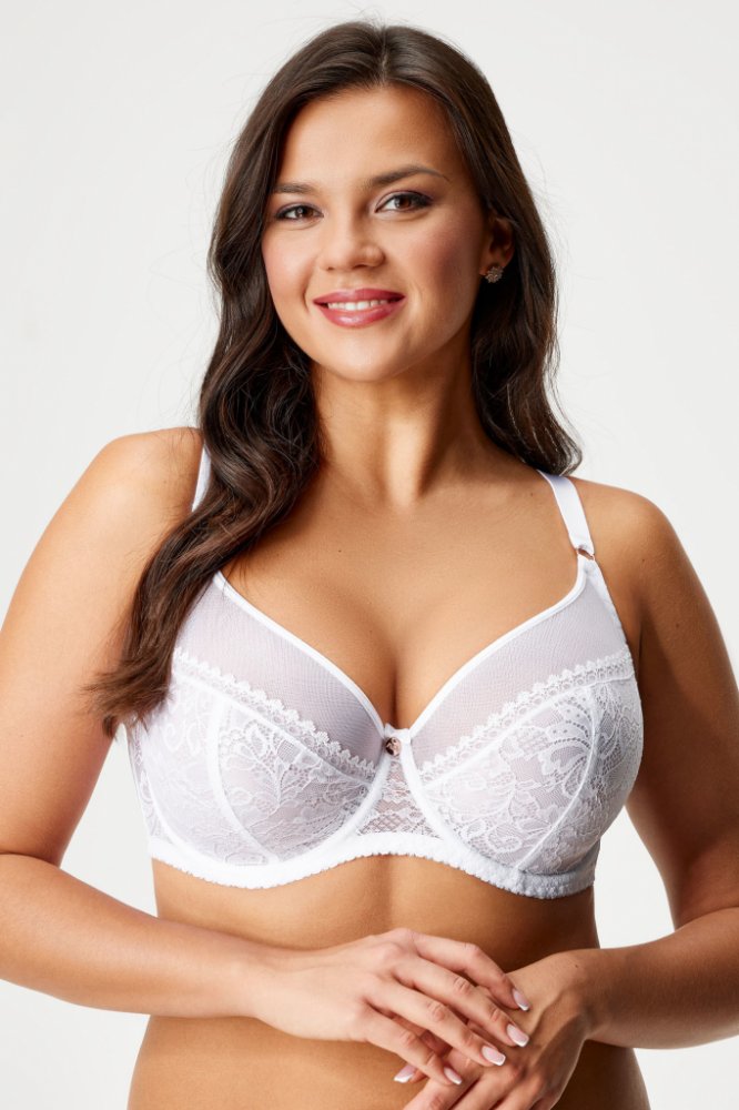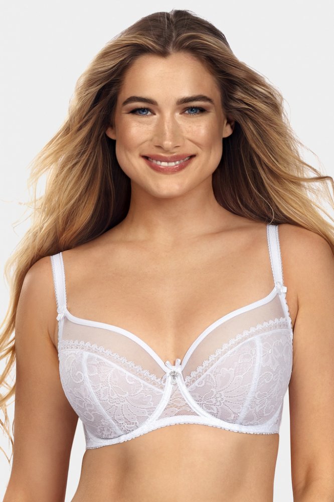 Smyslná měkká podprsenka v bílé barvě. Horní část košíčků je vyrobená z jemné síťovinky. Košíčky a můstek (střed podprsenky) jsou pokryté svůdnou krajkou. Dolní část košíčků je zesílená síťovinou. Zadní díl je vyrobený z pružné síťovinky. Mezi košíčky je umístěna mašlička se stylovou ozdobou. Podprsenka má svislé boční kostice. Ozdobná ramínka je možné nastavit, ale nelze je odepnout.