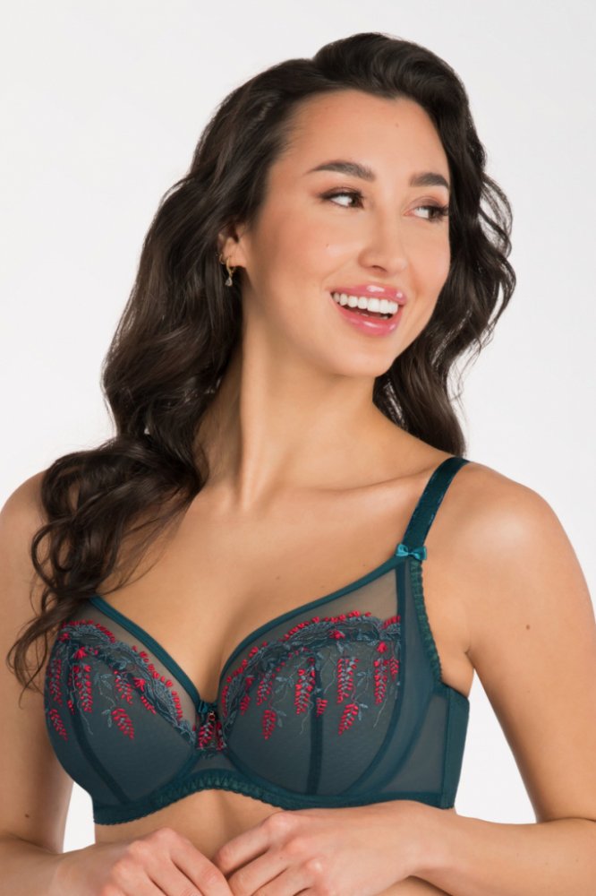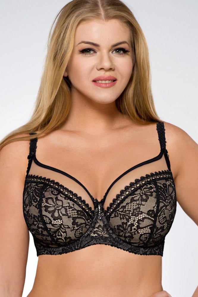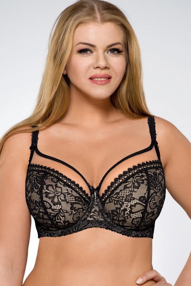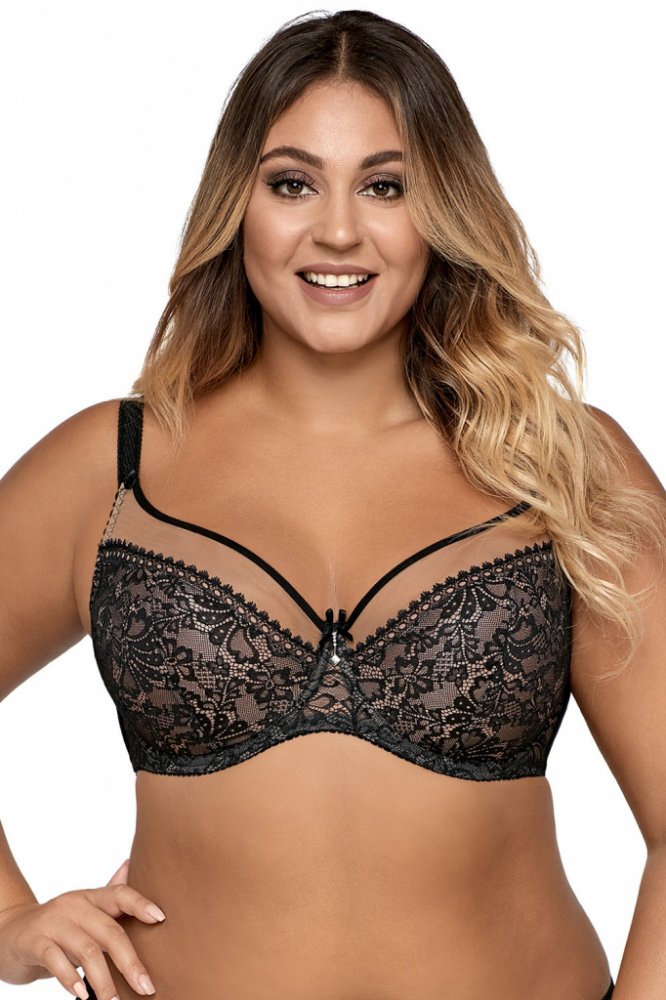 Tato soft podprsenka vás zaujme nejen krásnou krajkou, ale také pohodlným střihem vhodným i pro větší poprsí. Podprsenka je nevyztužená, typu soft. Je zpevněná kosticemi, a proto perfektně zformuje i větší poprsí a dobře padne. Je vyrobená z krajky a průhledného tylu tělové barvy. Zdobí ji mašličky a malý krystalek. Horní část košíčků lemují černé pásky. Ramínka můžete nastavit podle potřeby. Podp...