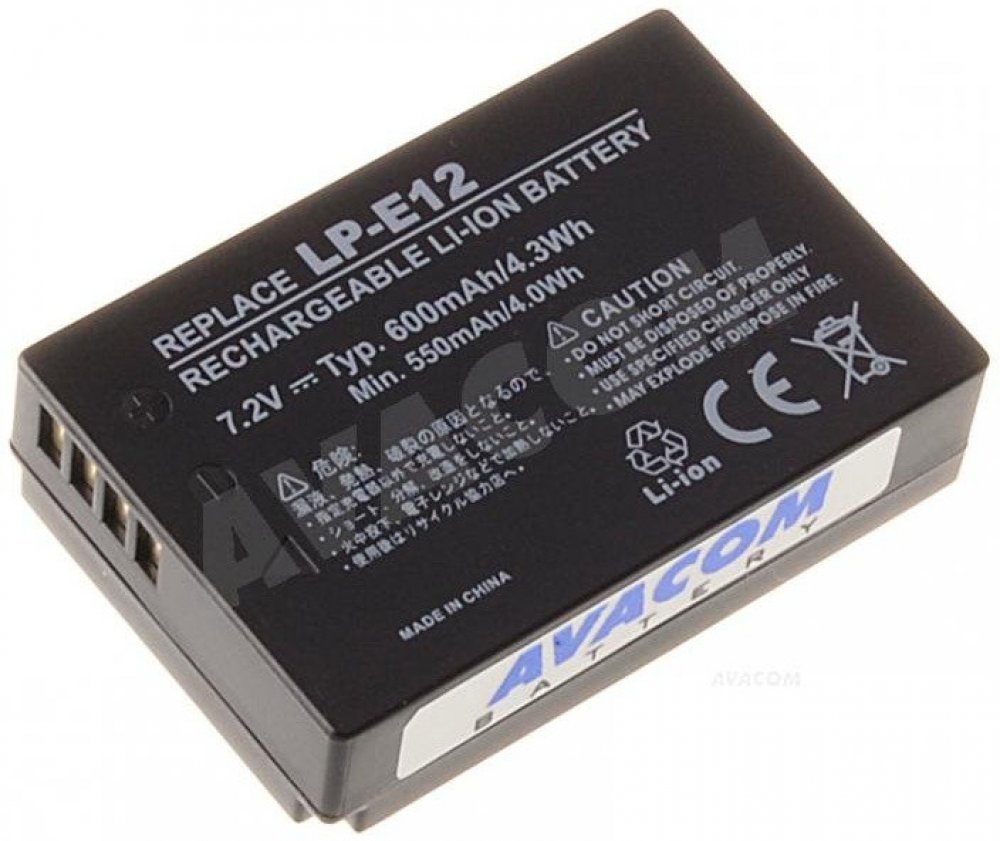 Klíčové vlastnosti baterie pro fotoaparát AVACOM za Canon LP-E12 Li-Ion 7.2V 750mAh 5.4Wh Alternativní 7,2V baterie Avacom pro fotoaparát má kapacitu 0,75 Ah Dokáže plně nahradit baterii Li-Ion Vydrží až 1200 nabíjecích cyklů Tento lithium-iontový akumulátor je lehký, bez paměťového efektu Má celkem 2 články Jak správně zacházet s baterií pro fotoaparát Baterii pro fotoaparát Avacom není vhodné odkládat zcela vybitou, protože by mohla začít ztrácet kapacitu. Nevystavujte ji přímému slunečnímu záření, teplotám nad 60 °C, ani teplotám pod bodem mrazu. Akumulátor chraňte rovněž před mechanickým poškozením, vlhkostí a před chemickými prostředky. Značka: Canon Model: EOS 100D, EOS M, EOS M100, EOS M50 a PowerShot SX70 HS