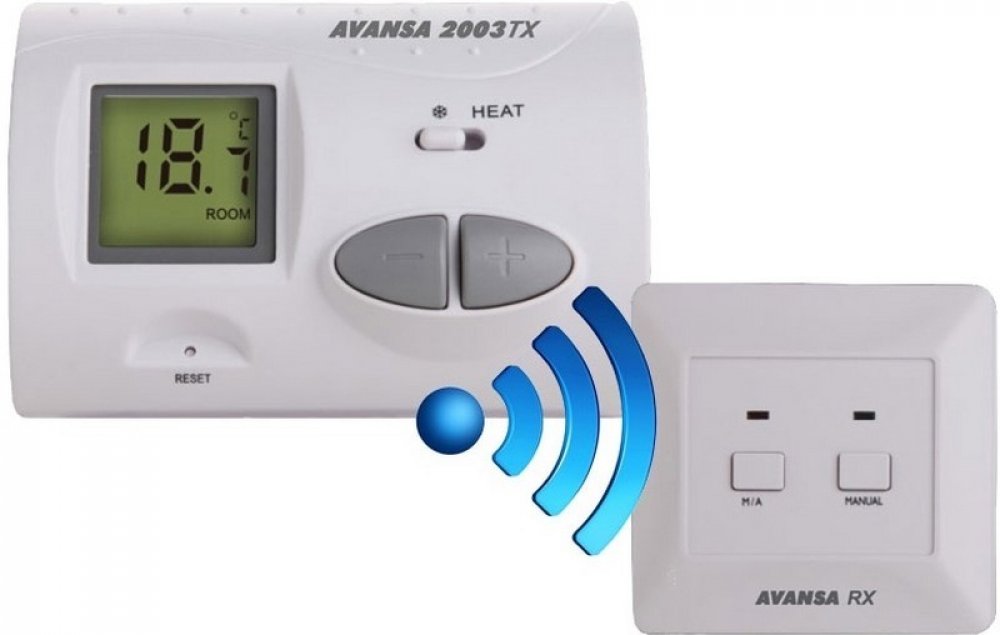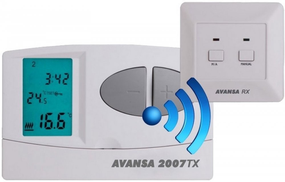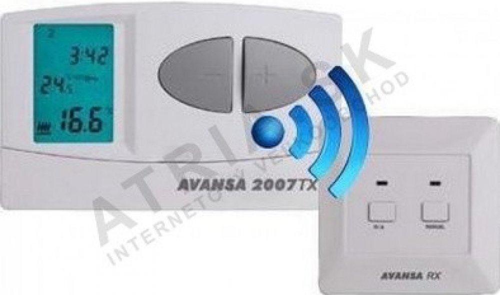 Bezdrátový termostat Avansa 2007 TX je vhodný k regulaci většiny kotlů. Termostat je možné připojit ke kterémukoli plynovému kotli, který disponuje přípojkou na pokojový termost s dvojitým vedením. Přístroj je možné připojit ke klimatizačnímu zařízení bez ohledu na to, zda zařízení disponuje provozním napětím 24V nebo 230V. Přístroj je možné naprogramovat dle Vašich potřeb tak, aby se topný (chladicí) systém ve Vámi požadovaném čase a na vámi požadovanou teplotu spustil. Umožňuje kromě zajištění pohodlí, i přispět ke snížení nákladů na energii. Je možné nastavit 6 různých časů zapnutí termostatu (s odstupňováním po 10 minutách) na každý den a s volně nastavitelnou teplotou (s odstupňováním po 0,5 ° C) ke každému ze šesti časů zapnutí. Přístroj se skládá ze dvou jednotek. Z jedné přenosné regulační jednotky (termostat) a z jedné přijímací jednotky, která slouží k ovládání kotle. Spojení mezi termostatem a přijímačem zajišťují radiofrekvenční vlny, proto není třeba vybudovat vedení mezi termostatem a kotlem. Obě jednotky jsou výrobcem přednastavené, aby fungovaly na stejné frekvenci. Termostat a přijímač disponují vlastním bezpečnostním kódem. Z tohoto důvodu nemohou neznámé rádiové signály narušit bezpečné fungování zařízení.