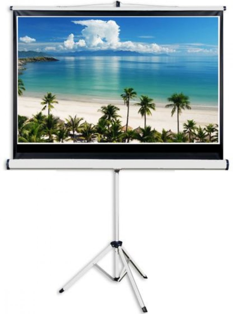 Mobilní stativové projekční plátno AVELI má stabilní základ na třech nohách. Plátno je matně bílé s černým orámováním s formátem 16:10.