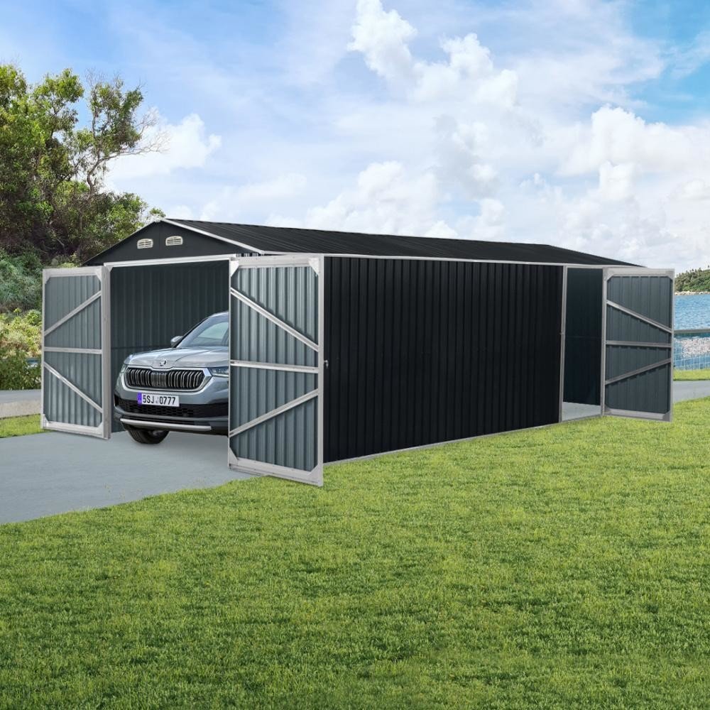 Kovový zahradní domek, garáž o rozměrech 602×300 cm je vyrobený z profilovaného plechu a se sílou stěny 0,3 mm. Zastavěná plocha domku je 17,11 m2. Boční zabudované dveře poskytují komfort bočního východu z domku. Čelní dvoukřídlá vrata o rozměru 212 x 186 cm jsou dostatečně velká i pro větší automobily typu SUV.