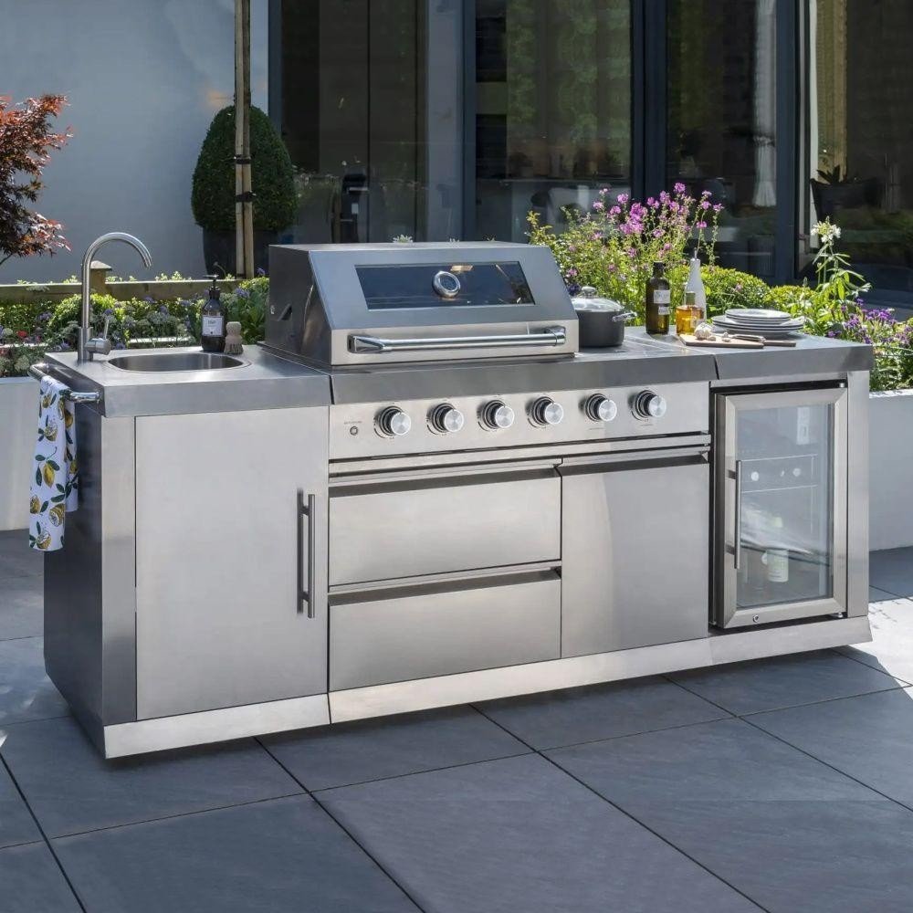 Pokud je grilování i vaší vášní, měli byste si pořídit to nejlepší vybavení, které vaše grilování posune na vyšší úroveň a potěší i ty nejnáročnější uživatele. S potěšením vám představujeme zahradní kuchyni OXFORD, která patří do skupiny plynových zahradních grilů. Díky její všestrannosti můžete všechny grilovací práce provádět na jednom místě. Máme na mysli nejen samotné grilování, ale také přípravu a krájení pokrmů, zajímavé řešení chlazení nápojů ve vestavěné chladničce a nakonec mytí veškerého potřebného nádobí, které je nedílnou součástí stolování. Precizně zpracovaný design grilu se čtyřmi hořáky ukrytými pod víkem a samostatným bočním hořákem umístěným v kovové skříňce na kolečkách předčí všechna očekávání. Výhodou grilu je také zabudovaný teploměr, který umožňuje sledovat a upravovat teplotu podle připravovaného pokrmu. Elektrické zapalování usnadňuje spuštění grilu a rukojeť na víku grilu zabraňuje případnému popálení. Součástí balení je hadice pro připojení láhve. Regulátor není součástí dodávky, je třeba jej dokoupit. Výkon jednoho hořáku je 2,63 kW. Velkou grilovací plochu oceníte zejména při různých rodinných oslavách nebo grilovacích párty s přáteli. Materiály použité při výrobě, jako je litinový rošt, práškově lakovaná ocel použitá na konstrukci grilu a ovládací panel z nerezové oceli, zaručují jeho dlouhou životnost. Tři skříňové moduly s dvířky jsou ideální pro manipulaci s mnoha grilovacími nástroji a hotové pokrmy můžete snadno připravovat a odkládat na pracovní desku, která je součástí této zajímavé zahradní kuchyně. V neposlední řadě je třeba zmínit i obrovskou výhodu této jednotky, a to dřez s baterií, který se postará o bezproblémové čištění všech nástrojů, náčiní a celého vybavení. Celkové rozměry zahradní plynové kuchyně jsou (ŠxHxV): 245 x 119 x 60 cm a barevné provedení je v elegantní černé barvě v kombinaci s chromovanými díly. Plynová zahradní kuchyně OXFORDU se tak skládá ze tří částí, které se společně stávají klíčovým pomocníkem pro skvělé grilování během letní sezóny.
