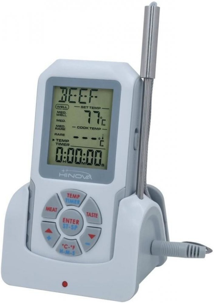 Digitální termosonda na potraviny umožňuje okamžité a naprosto přesné odečtení teploty pečeného masa . Obsahuje seznam ideálních teplot pro přípravu vašich jídel. Jednoduše si navolíte druh masa, požadovaný stupeň propečení a sledujete než teplota uvnitř masa dosáhne potřebnou teplotu, kterou vám teploměr doporučí. Termosonda je propojena se základnou .