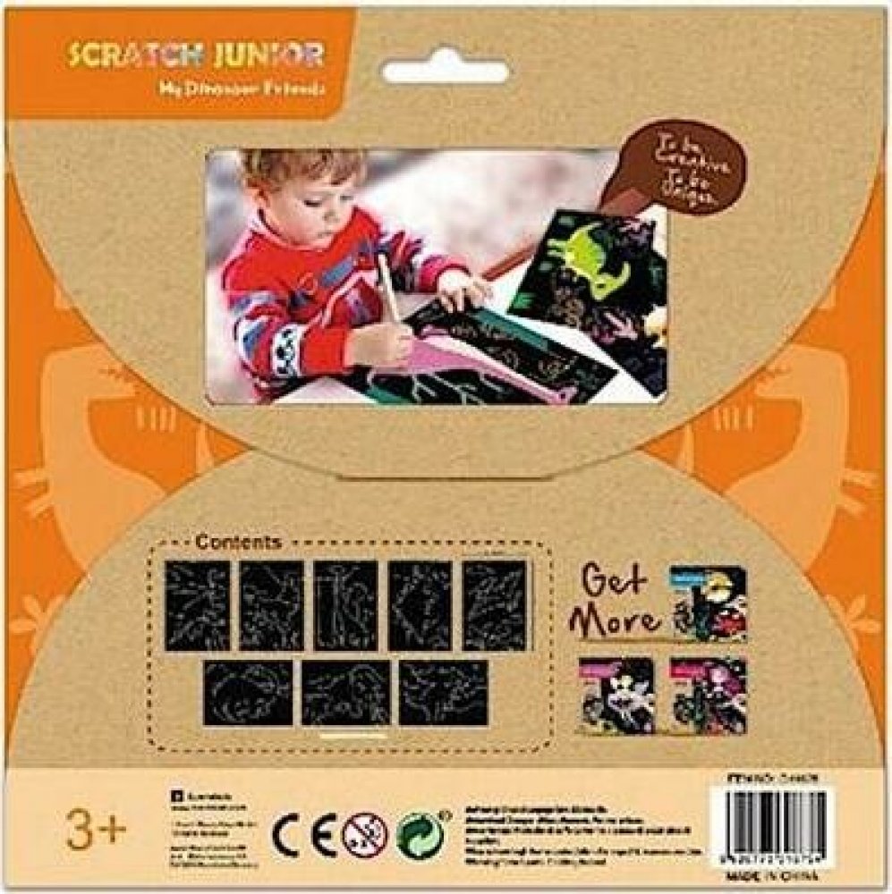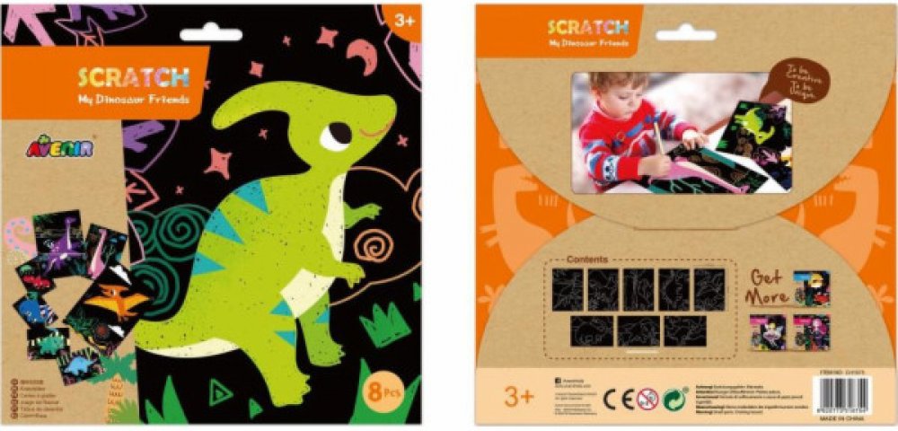 Škrábací obrázky Avenir přináší netradiční kreativní zábavu nejen pro děti. V sadě najdete 8 obrázků s různými dinosaury. Na ty mohou děti pomocí dřevěného vyškrabávacího pera kreslit, co se jim zlíbí. Pod černou vrstvou je barevná, takže výsledný obrázek je po vyškrabávání hezky pestrý a je jen na dětech, jak ho zkrášlí.
