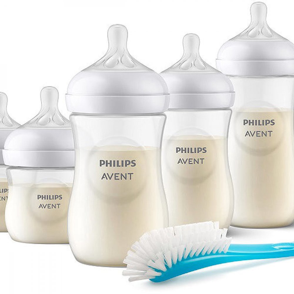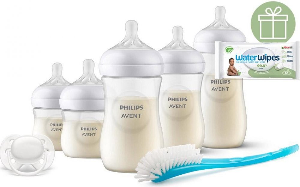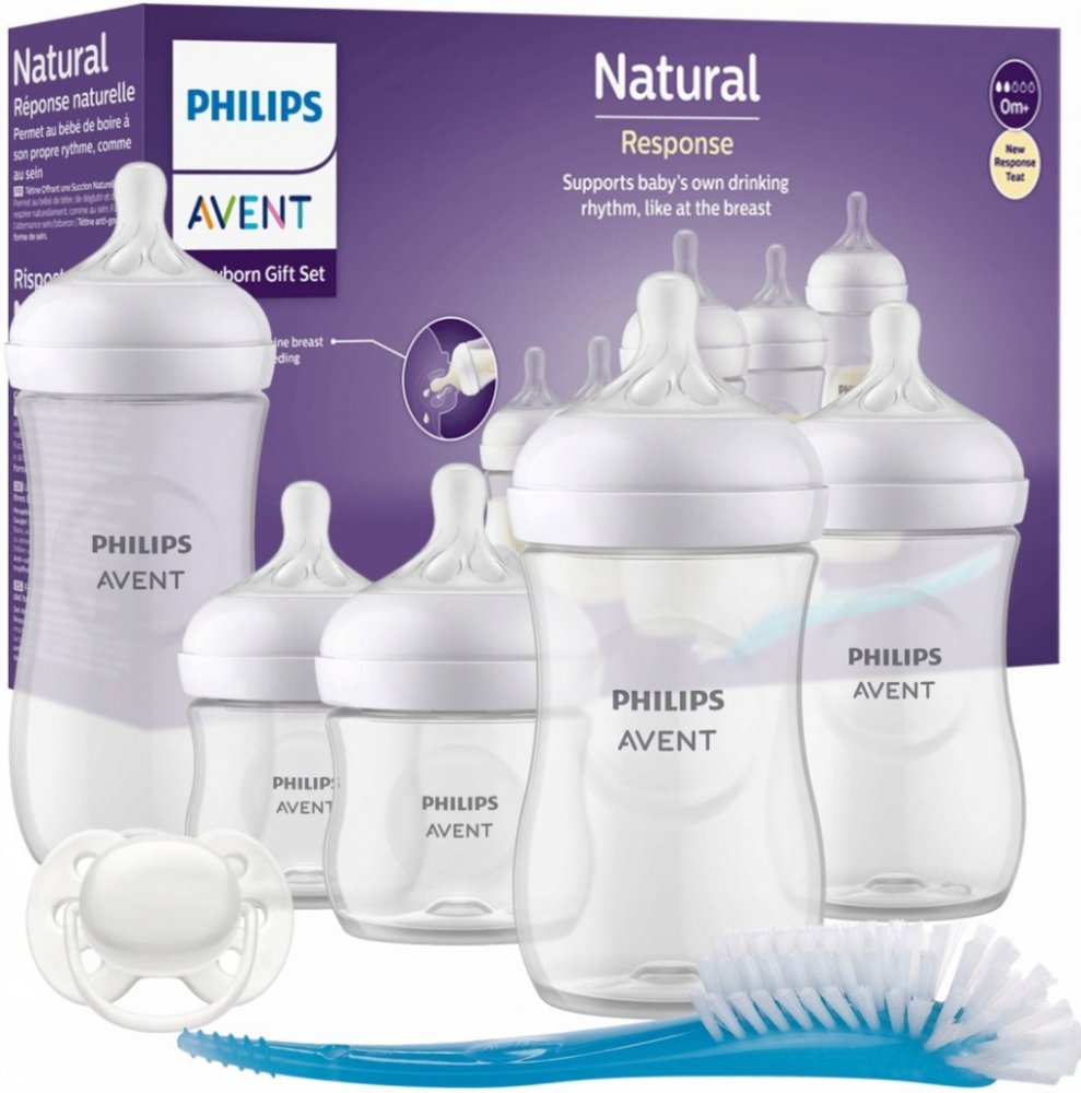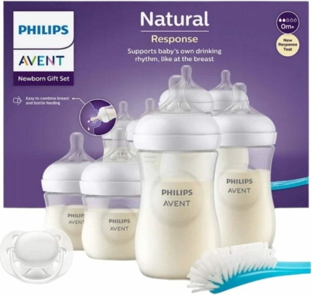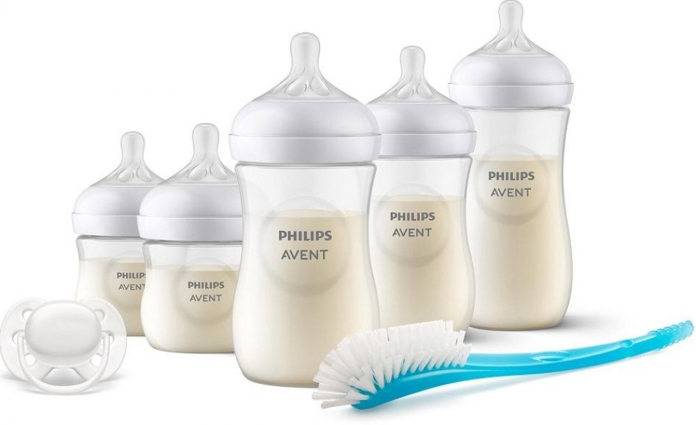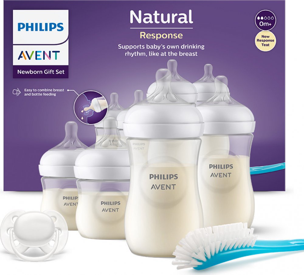 Novorozenecká startovací sada obsahuje láhve Natural Response s dudlíky na podporu rytmu pití dítěte podobně jako s prsu.