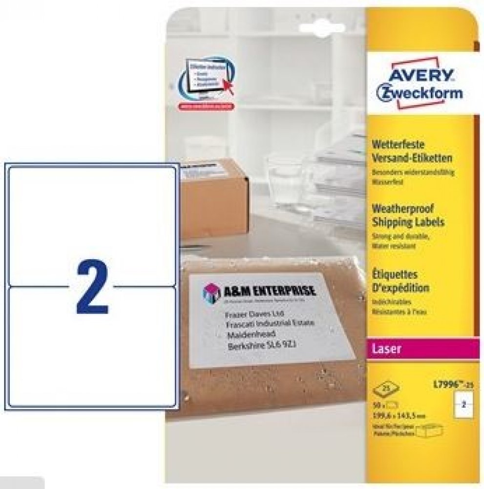 Adresní etikety jsou odolné vůči vodě, špíně, roztrhnutí, UV, teplotě, což zajišťuje jejich odolnost vůči vlivům počasí, 25 listů A4 v balení. Jsou ideální pro malé či velké poštovní balíky, dopisní obálky, rozeslané do velkých vzdáleností (zahraničí) apod. Etikety snadno vytisknete pomocí šablon, které jsou součástí softwaru dodávaného firmou AVERY ZWECKFORM. Software je k dostupný i na našich po...