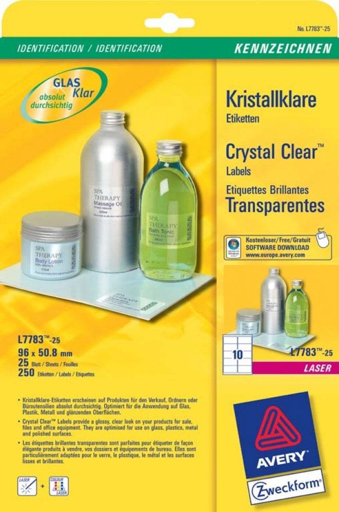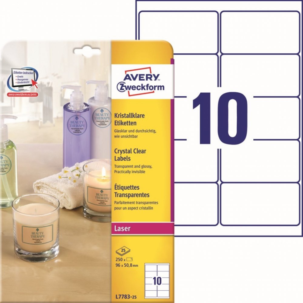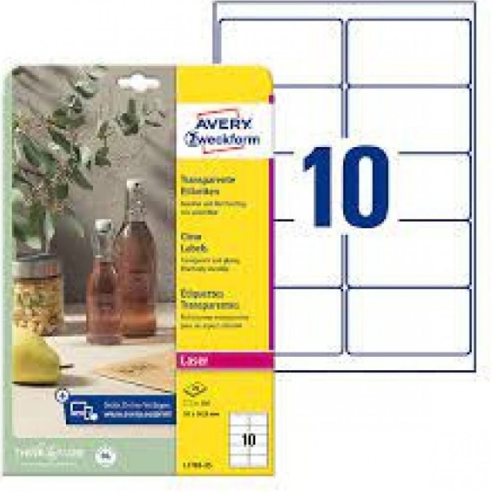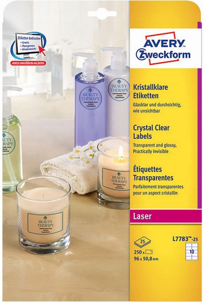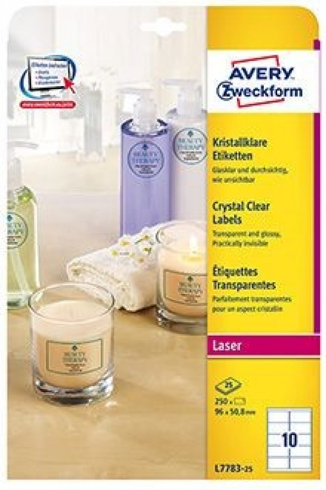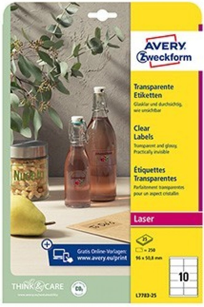 Průhledné lesklé etikety AVERY-ZWECKFORM. 25 listů v balení na formátu A4. Ideální na lesklé povrchy.