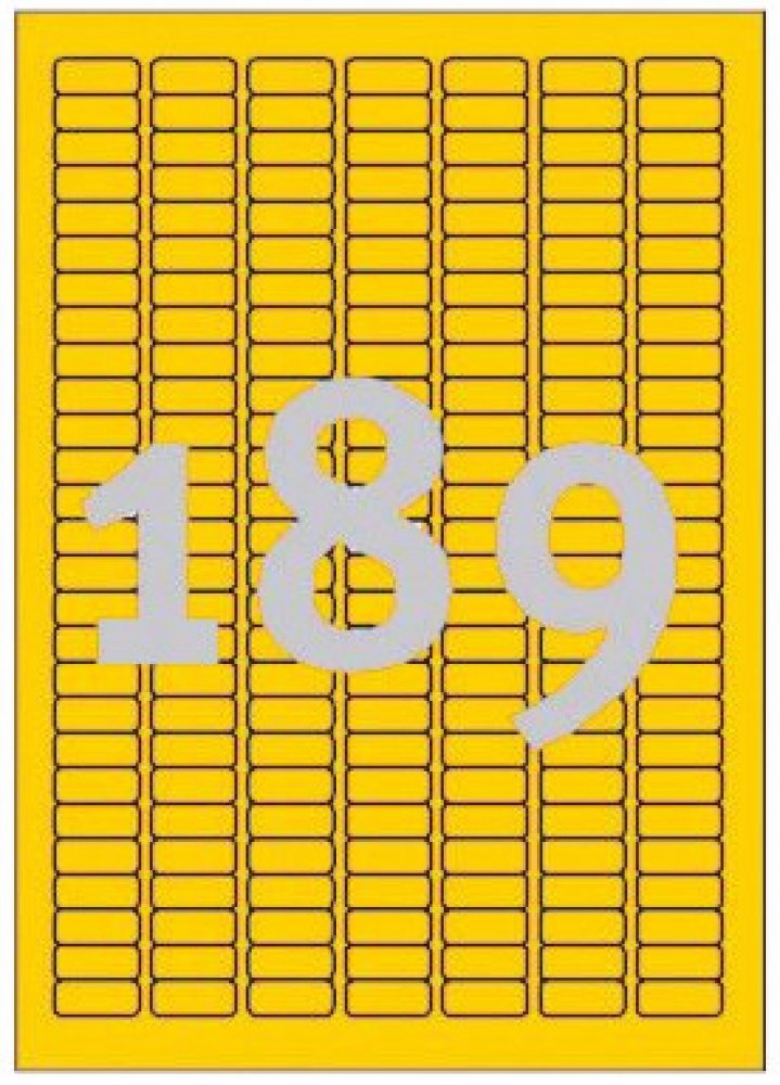 Rozměr štítku: 25,4 x 10 mm Typ potisku štítků: Tiskárma laserová, inkoustová, kopírka, barevná laserová Barva štítků: Žlutá Materiál štítků: Papír Počet listů v balení: 20 Počet štítků na A4: 189 Počet štítků v balení: 3780
