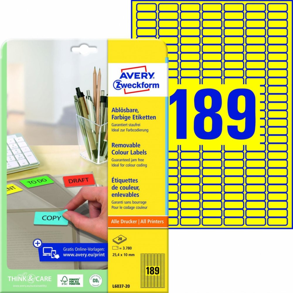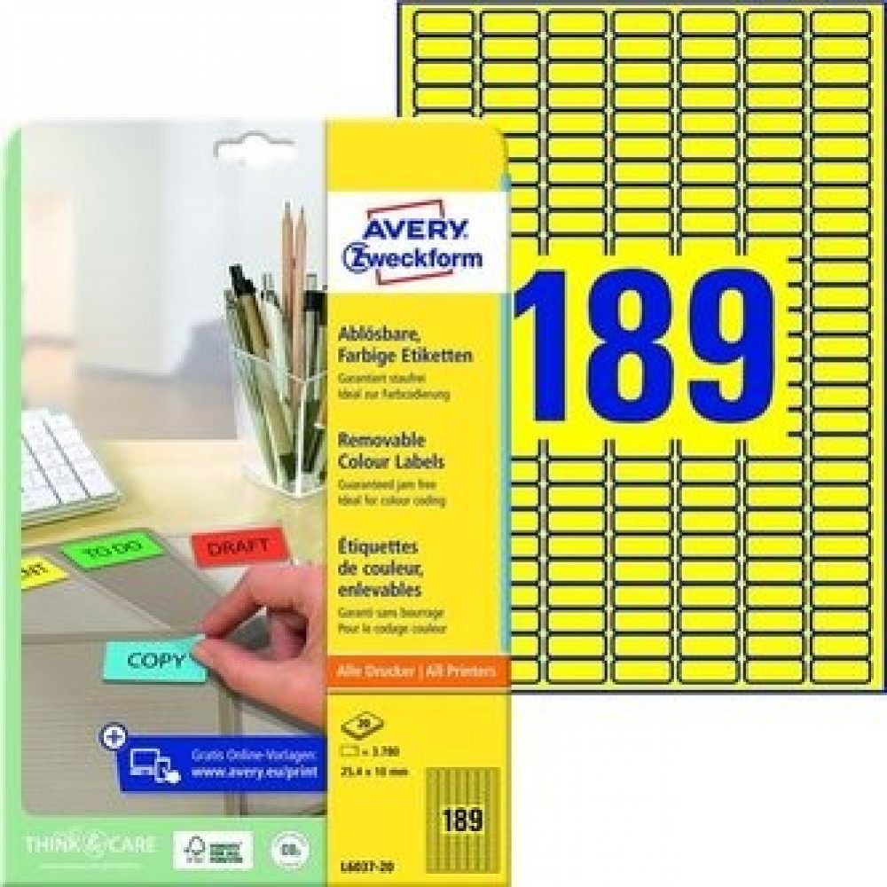 Mini etikety AVERY-ZWECKFORM, barva žlutá. 20 listů v balení na formátu A4. Ideální pro tisk cenovek na zboží, barevné rozlišení výrobků, cenové akce.