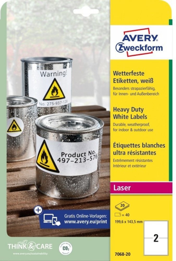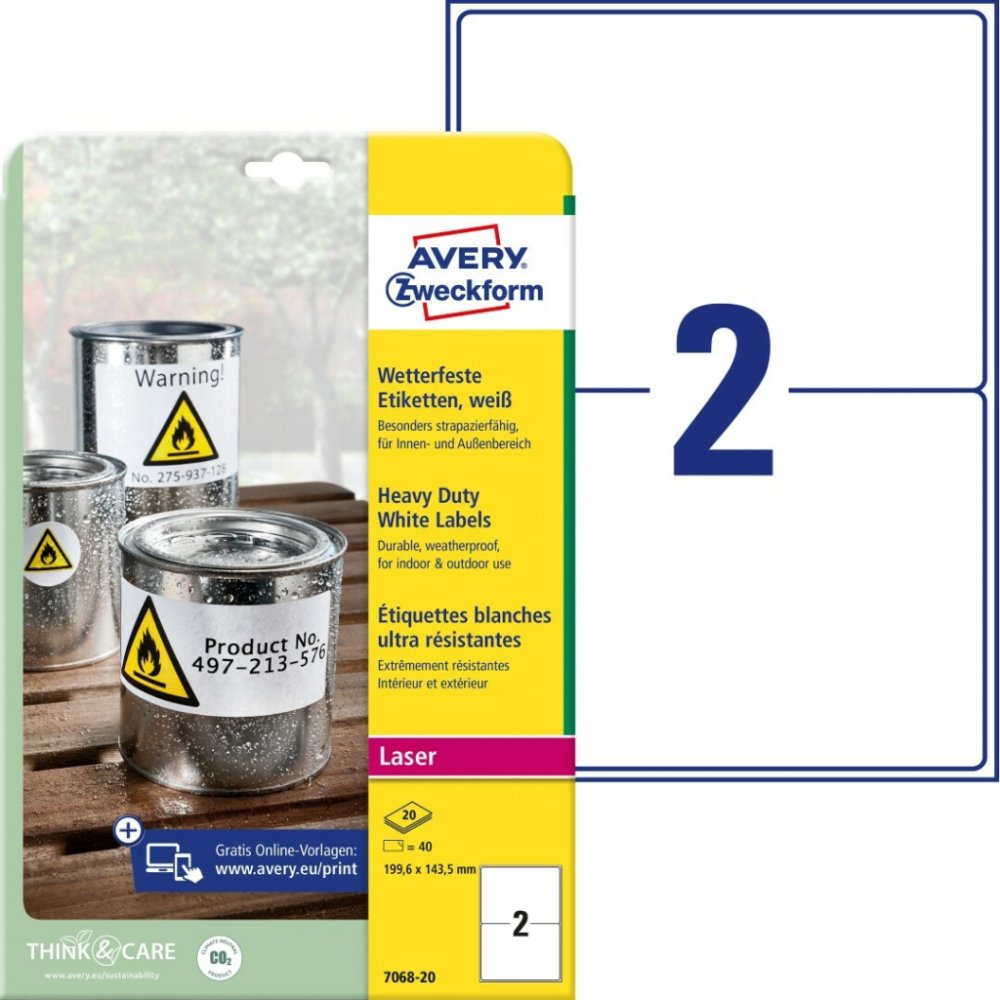Odolné samolepicí štítky Avery Zweckform L7068-20 o rozměru 199,6 x 143,5 mm jsou určeny do náročných vnitřních i venkovních podmínek. Jsou ideální pro trvalé a dlouhodobé značení majetku, výrobků, skladových regálů, palet, zařízení či nářadí. Díky vysoké a stálé lepivosti spolehlivě drží na většině běžných povrchů. Tyto bílé polyesterové etikety (PET) s permanentním lepidlem jsou odolné vůči stříkající vodě, nečistotám, olejům, mastnotě, roztržení, UV záření a teplotám od -20 °C do +80 °C.