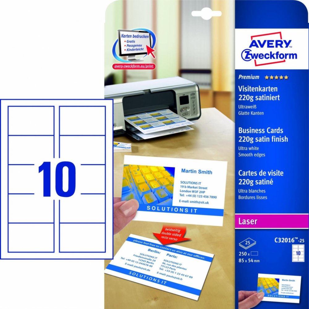 Vizitky mají rozměr 85x54 mm. Balení obsahuje 250 ks vizitek. Jsou na fotopapíře, který má gramáž 220g/m2.