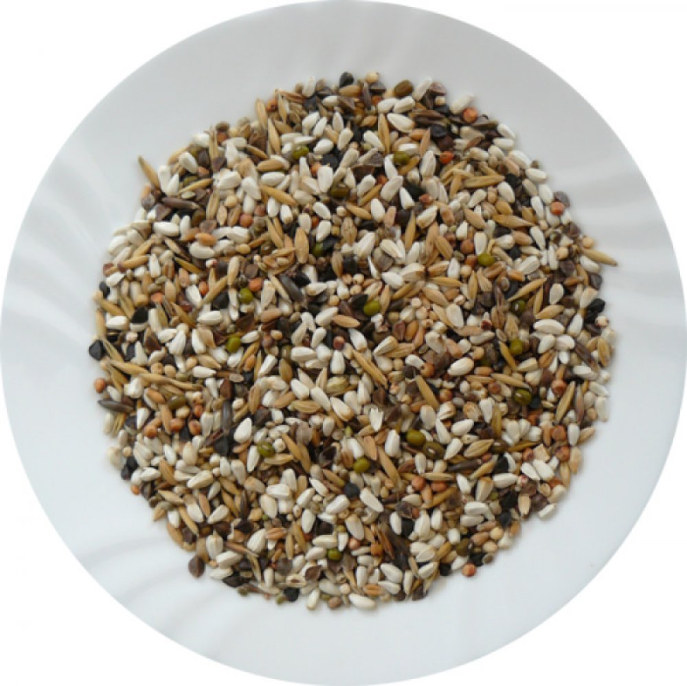 Složení: Slunečnice bílá (velkozrnná, malozrnná), slunečnice žíhaná (velkozrnná, malozrnná), čirok, dari, peluška, kardi, rýže, ostropestřec, katiang, kukuřice (žlutá, červená), pohanka, oves celý, dýně, semenec, sója, hrách (žlutý, zelený), pšenice, vikev.
