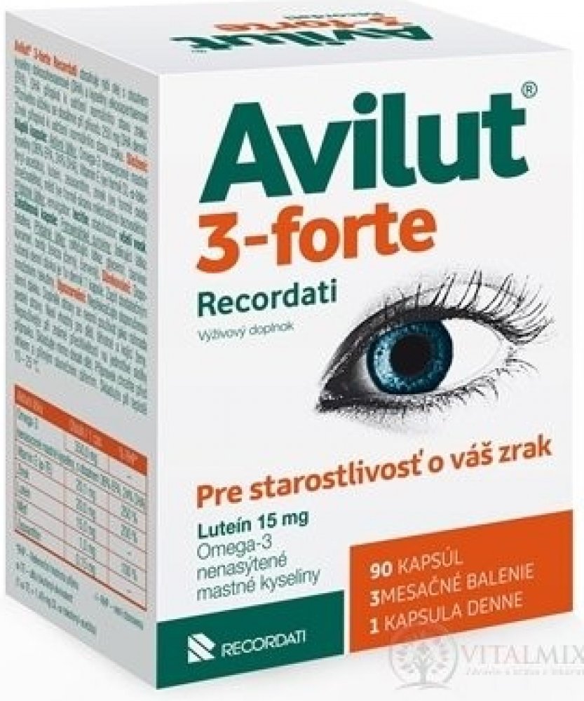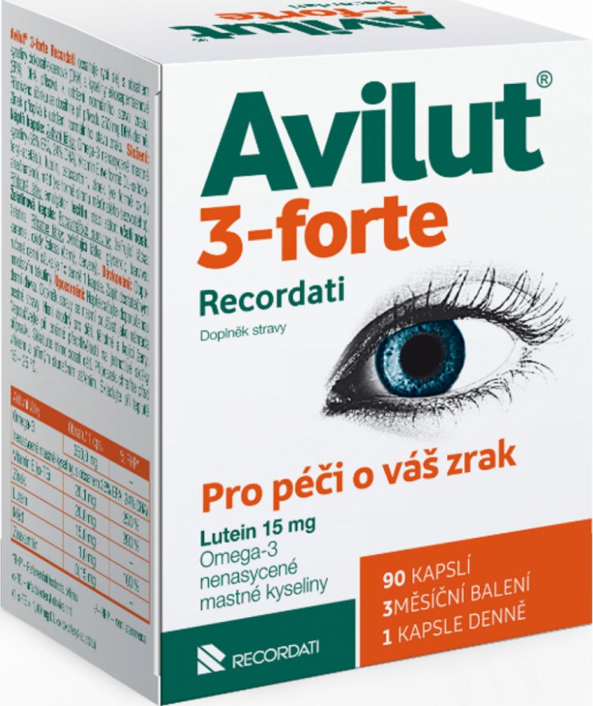 AVILUT® 3-forte RECORDATI obsahuje rybí olej s obsahem kyseliny dokosahexaenové (DHA) a kyseliny eikosapentaenové (EPA). DHA přispívá k udržení normálního stavu zraku. Příznivého účinku se dosáhne při přívodu 250 mg DHA denně. Zinek přispívá k udržení normálního stavu zraku.