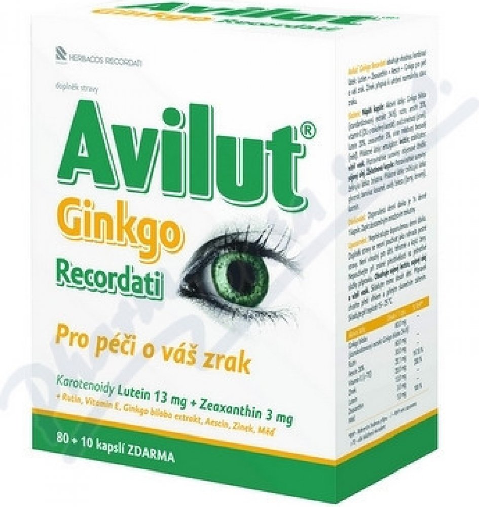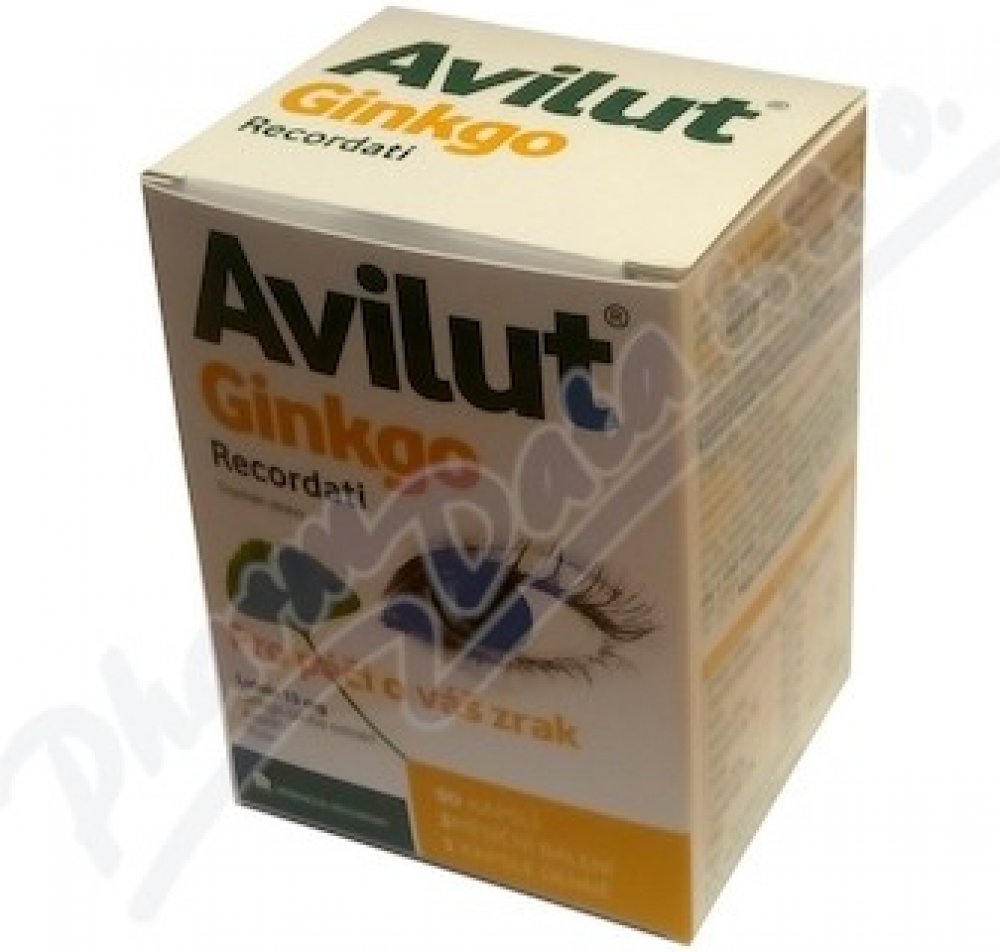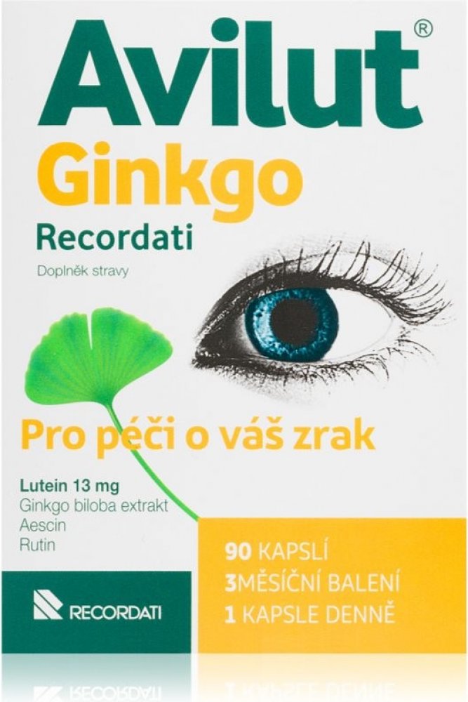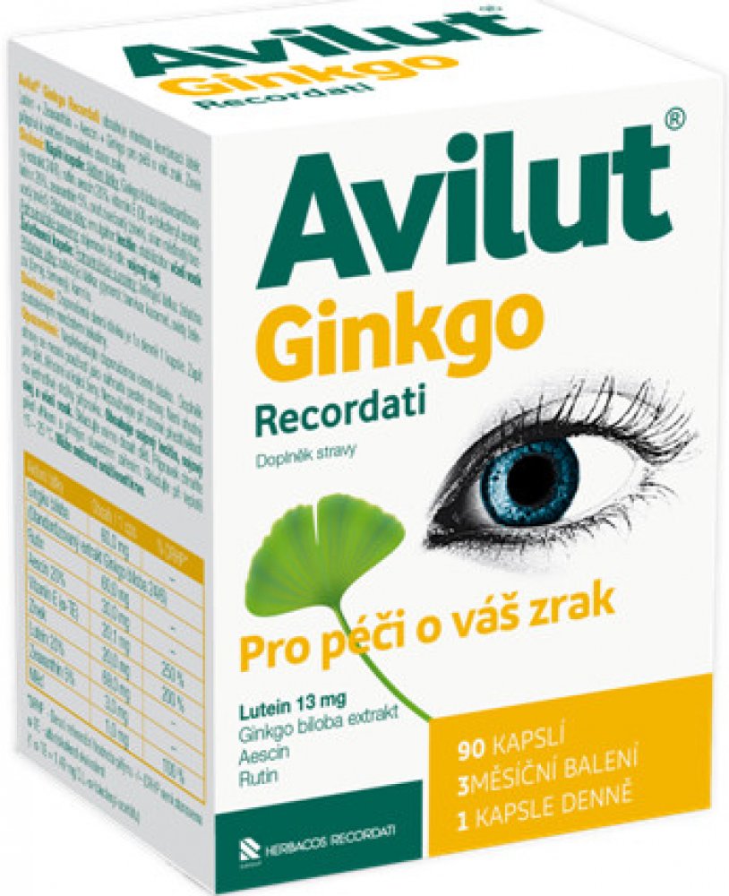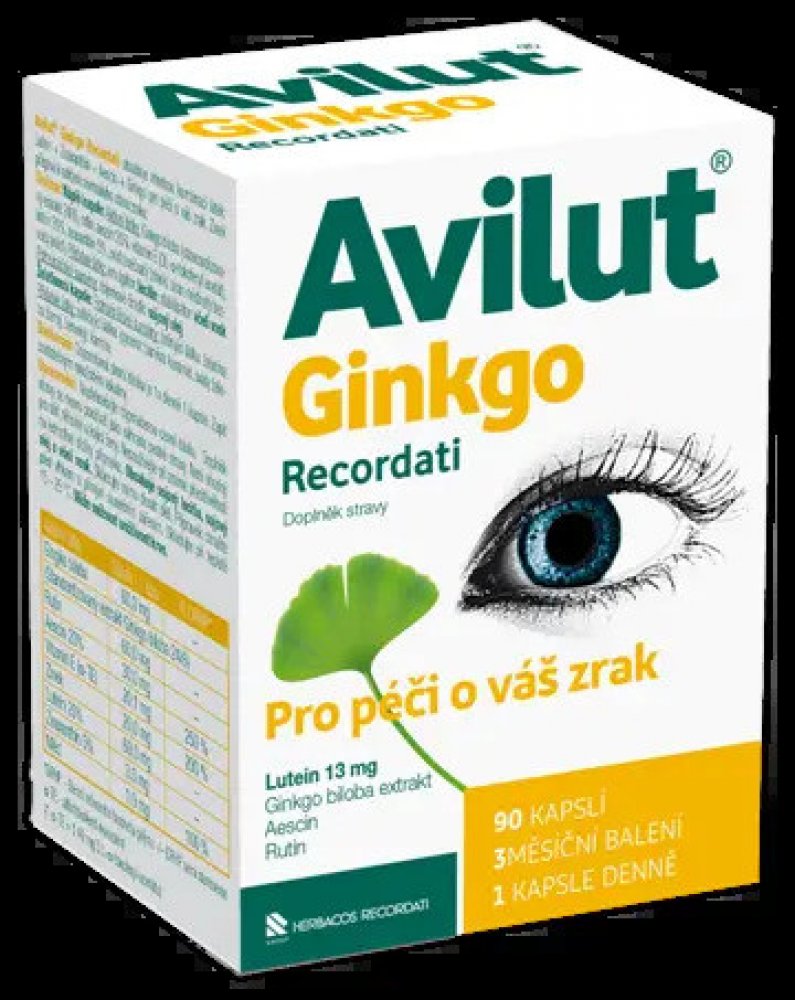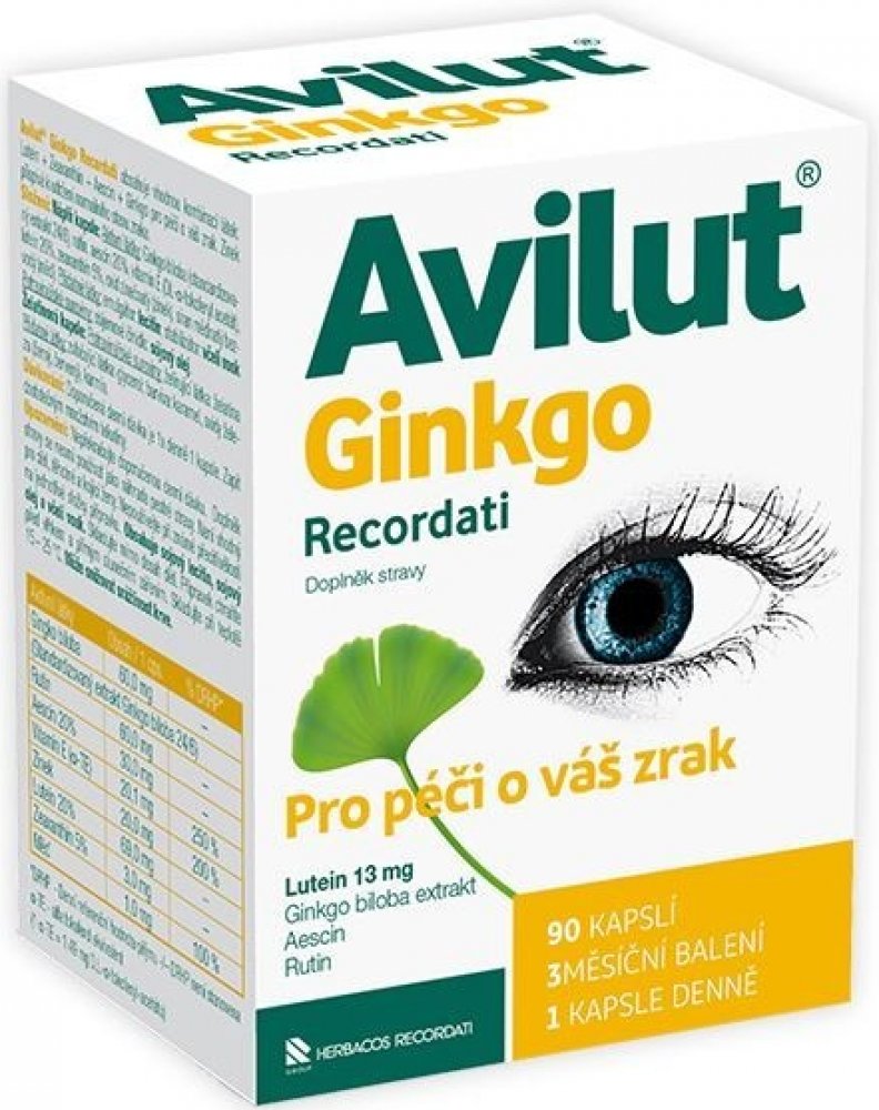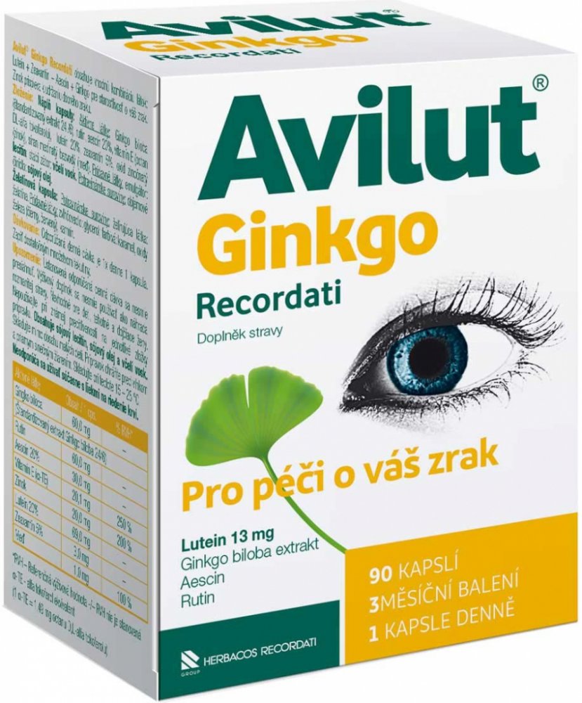 Herbacos 90 tbl kapsle zrak unisex Avilut pro dospělé perorální bez příchutě ginkgo biloba zrak, uši a ústa 90 60.0 mg Kdykoliv 1 za den Pokojová teplota (do 25°C), Chránit před světlem/sluncem, Mimo dosah d