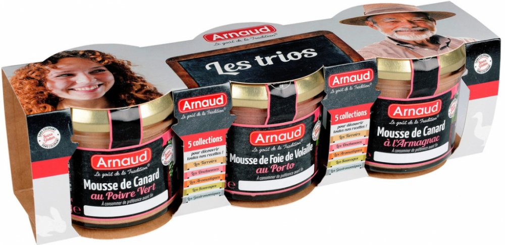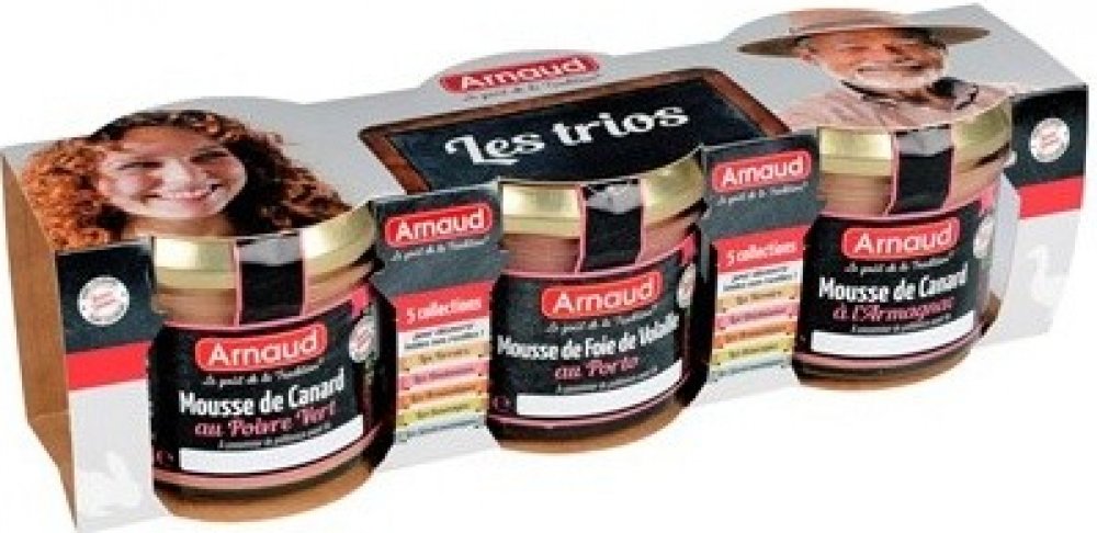 Kuřecí játra 50%, vepřové maso, MLÉKO, vejce, sůl, portské víno 1%, koření, přírodní aroma. Vepřové sádlo, kachní libové játra 20%, voda, kuřecí játra, kachní sádlo, vejce, modifikovaný škrob, Armagnac 1%, sůl, konzervant: dusitanová sůl, mléčné bílkoviny, přírodní aroma. Vepřové sádlo, kachní libové, játra 20%, voda kuřecí játra, husí sádlo, vejce, modifikovaný škrob, koňak, zelený pepř 0,9%, sůl, konzervant: dusitanová sůl, mléčné bílkoviny, přírodní aroma. Alergeny: MLÉKO, vejce.