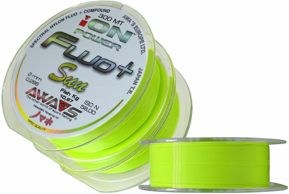 Nová série FLUO+ rozšiřuje řadu vlasců AWA´S ION POWER o špičkové monofily s mimořádnými vlastnostmi a vynikajícími fyzikálními parametry.Série FLUO+ zahrnuje tři barevné varianty -žlutou fluo s označením SUN,oranžovou fluo s označením CORAL a černou BLACK.Tyto monofily jsou vyrobené s použitím nejkvalitnějších MITSUBISHI NOVAMID NT polymerů,které jsou díky jedinečnému výrobnímu procesu barvené na molekulární úrovni,což znamená,že barva je už přímo navázaná na základní surovinu-polymér,ještě před jeho použitím při výrobě samotného monofilu.Díky tomu se podařilo vyvinout monofil s vysokou lineární i uzlovou pevností a stálou barevností.Vlasce FLUO+ jsou určené k širokému použití,atˇuž při lovu kaprů,na přívlač nebo při mořském rybolovu.Jejich barva díky dobré viditelnosti při různých světelných podmínkách napomáhá jak při nahazování a kontrole pozice nástrahy,tak i při zdolávání úlovku a přitom pod vodní hladinou zůstává pro rybu téměř neviditelná.Balené jsou na dvou spojených cívkách,na každé po 300 m v paralelním hladkém návinu (PLS-Paralell Line Spooling),takže spodní vrstvy zůstávají perfektně hladké a nestlačené od vrchních vrstev,což napomáhá k jejich delší životnosti a k dosahování delších hodů.