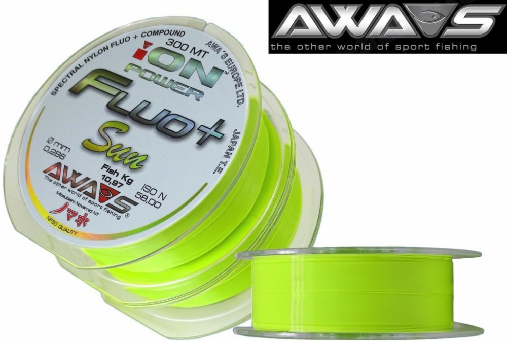 Nová série FLUO+ rozšiřuje řadu vlasců AWA´S ION POWER o špičkové monofily s mimořádnými vlastnostmi a vynikajícími fyzikálními parametry. Série FLUO+ zahrnuje tři barevné varianty -žlutou fluo s označením SUN, oranžovou fluo s označením CORAL a černou BLACK. Tyto monofily jsou vyrobené s použitím nejkvalitnějších MITSUBISHI NOVAMID NT polymerů, které jsou díky jedinečnému výrobnímu procesu barvené na molekulární úrovni, což znamená, že barva je už přímo navázaná na základní surovinu-polymér, ještě před jeho použitím při výrobě samotného monofilu. Díky tomu se podařilo vyvinout monofil s vysokou lineární i uzlovou pevností a stálou barevností. Vlasce FLUO+ jsou určené k širokému použití, atˇuž při lovu kaprů, na přívlač nebo při mořském rybolovu. Jejich barva díky dobré viditelnosti při různých světelných podmínkách napomáhá jak při nahazování a kontrole pozice nástrahy, tak i při zdolávání úlovku a přitom pod vodní hladinou zůstává pro rybu téměř neviditelná. Balené jsou na dvou spojených cívkách, na každé po 300 m v paralelním hladkém návinu (PLS-Paralell Line Spooling), takže spodní vrstvy zůstávají perfektně hladké a nestlačené od vrchních vrstev, což napomáhá k jejich delší životnosti a k dosahování delších hodů.