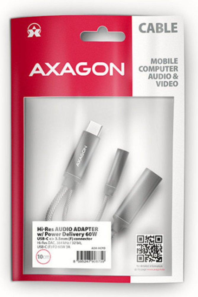 AXAGON ADA-HCPD Hi-Res DAC AUDIO ADAPTER je ideální doplňkem pro váš telefon, tablet, notebook nebo stolní počítač s USB-C konektorem, který vám poskytne chybějící 3.5 mm audio jack. Velkou výhodu představuje integrovaný konektor Power Delivery, který umožňuje současné připojení nabíječky a tím poskytuje možnost napájení připojeného telefonu. Adaptér obsahuje vysoce kvalitní DAC převodník, který p...
