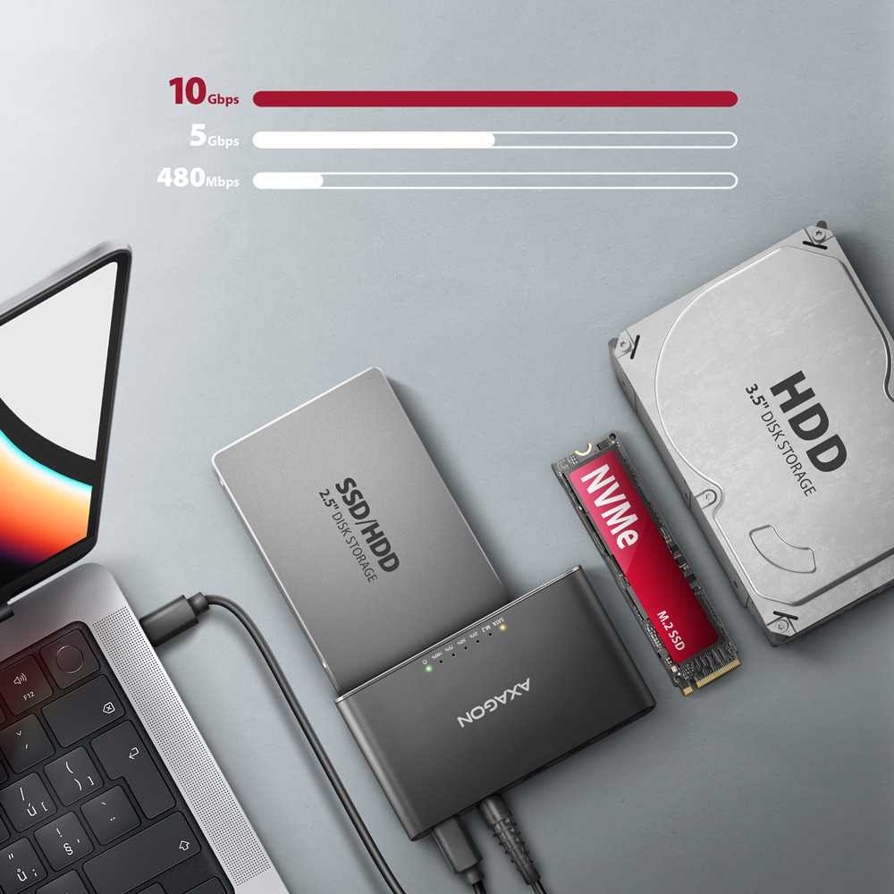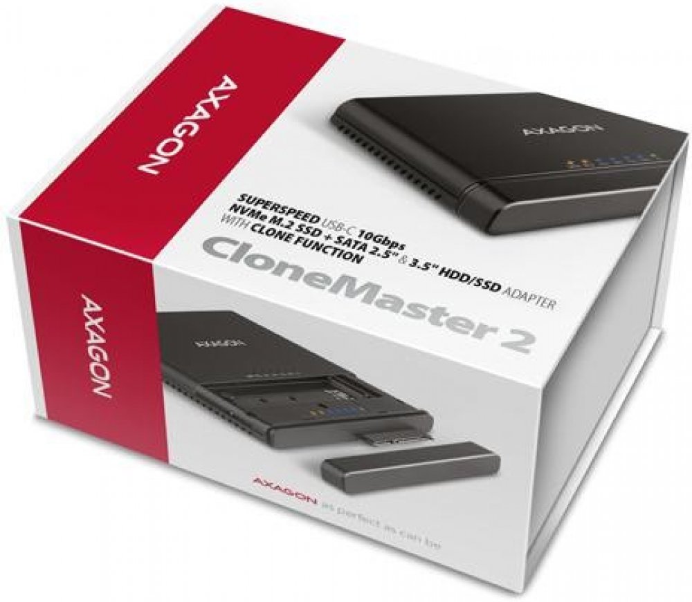 Univerzální USB-C 10Gbps adaptér AXAGON ADSA-CC CLONE MASTER 2 připojí k počítači snadno a rychle až dva disky současně. Jakýkoliv 2.5" nebo 3.5" disk snadno připojíte přímo k externímu SATA konektoru adaptéru. NVMe M.2 disk jednoduše vložíte do těla adaptéru bez použití šroubováku nebo jiných nástrojů. K adaptéru můžete připojit i SATA M.2 disk s použitím redukce jako je například AXAGON RSS-M2SD...