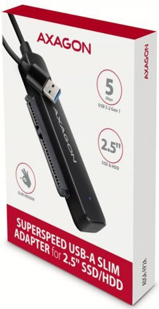 USB-A 5Gbps adaptér pro rychlé připojení 2.5" SATA SSD/HDD, napevno kabel 20 cmKompaktní AXAGON ADSA-FP2A SLIM adaptér s USB-A 5Gbps a SATA 6G rozhraním určený pro 2.5" SATA pevné disky nebo SSD. Připojení k počítači umožňuje napevno uchycený USB-A kabel délky 20 cm. Díky rozhraní USB 3.2 Gen 1 je přenosová rychlost až 5 Gb/s, funkce Plug & Play zajistí automatické připojení k počítači.