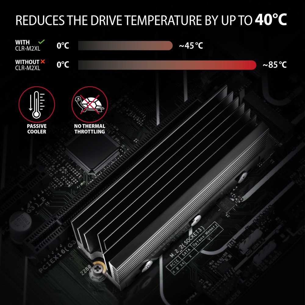 Žebrovaný hliníkový XL pasiv vysoký 32 mm, spolu s kovovým rámečkem, napomáhá optimálně odvádět teplo vzniklé při provozu M.2 SSD disku a umožňuje tak snížit teplotu disku až o 40 °C. Prodlužuje se tak životnost SSD disku a zamezí odepsat zpomalování rychlosti disku tzv. „Thermal Throttling“.